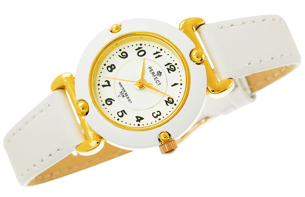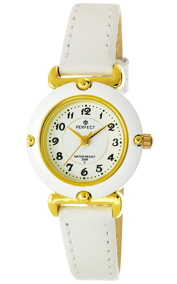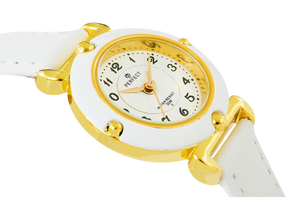 Zegarek prezentowy dla dziecka marki Perfect na Komunię Świętą. Zegarek na białym skórzanym pasku. Złote wskazówki, czarne indeksy na białej tarczy z cyframi arabskimi. Biało-złota koperta zegarka w rozmiarze 25 mm.