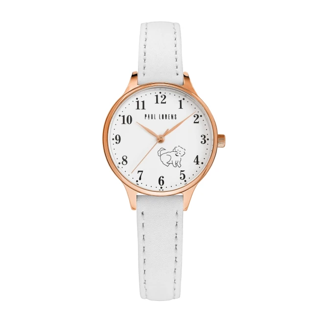 Paul Lorens PL12491A2-3C2-3 to zegarek dla dziewczynki na białym skórzanym pasku, z kopertą 30 mm i tarczą ozdobioną motywem pieska. Ten model dobrze sprawdza się jako pierwszy zegarek dla dziecka albo lekki model prezentowy na ważniejszą okazję.