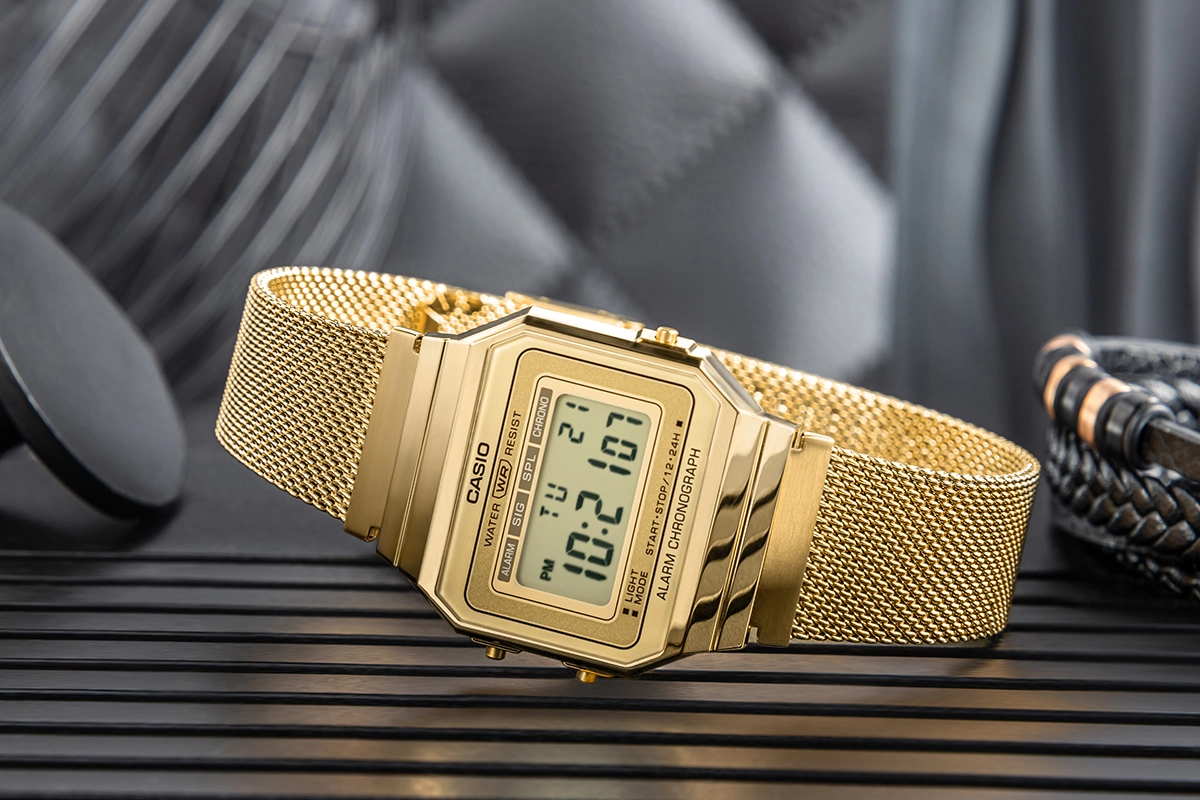 Casio A700WMG-9ADF należy do linii Casio Vintage i stawia na bardzo smukłą, cyfrową formę. To model, który nosi się wyjątkowo lekko i płasko na nadgarstku, a przy tym zachowuje pełen zestaw podstawowych funkcji przydatnych na co dzień.