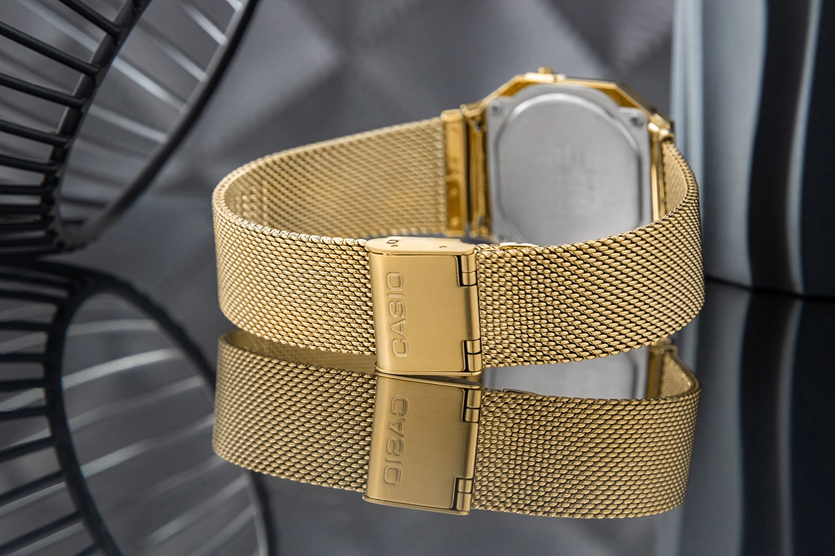 Złota koperta, złota siateczkowa bransoleta i jasny wyświetlacz podkreślają retro charakter tej serii, ale całość zostaje lekka i bardzo smukła na nadgarstku.