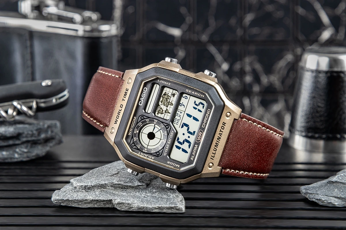 Casio AE-1200WHL-5AVDF to męski zegarek cyfrowy z kultowej serii Casio Collection, który w wyjątkowy sposób łączy wojskowy styl i retrodesign z nowoczesną technologią. Solidna koperta z tworzywa sztucznego, szkiełko haselitowe oraz wytrzymały pasek skórzany tworzą lekką, a zarazem niezwykle wygodną konstrukcję, idealną na co dzień i w podróży. Ciemnozielona kolorystyka z czarnymi akcentami i prostokątna tarcza LCD z mapą świata nadają zegarkowi charakterystyczny, przygodowy wygląd inspirowany stylem vintage. Model wyposażono w funkcję czasu światowego (World Time), pięć alarmów dziennych, stoper 1/100 sekundy, timer odliczania, automatyczny kalendarz oraz podświetlenie LED z regulacją czasu świecenia. Zasilany baterią o żywotności do 10 lat, oferuje również wodoszczelność 100 metrów, dzięki czemu doskonale sprawdzi się zarówno w miejskiej dżungli, jak i w terenie. Casio to zegarek dla mężczyzn, którzy cenią niezawodność, funkcjonalność i ponadczasowy design z nutą przygody.