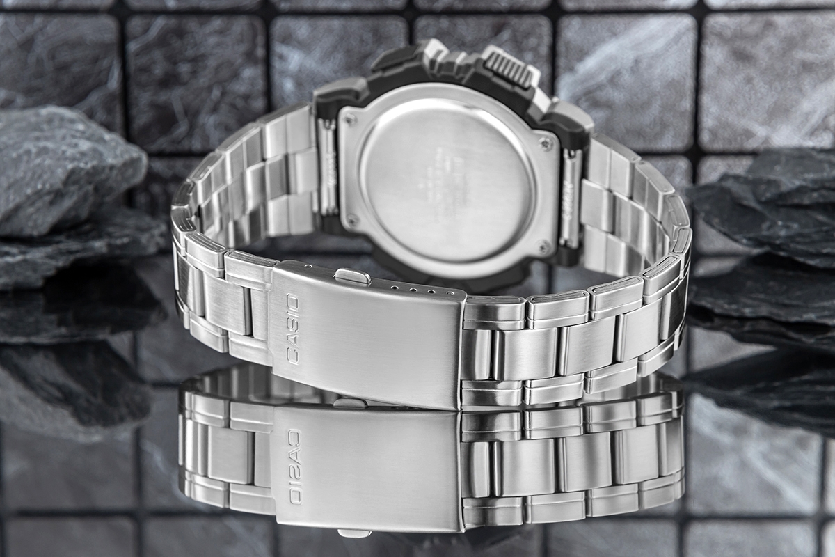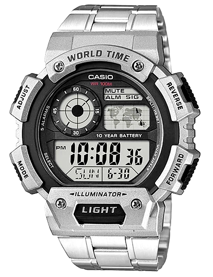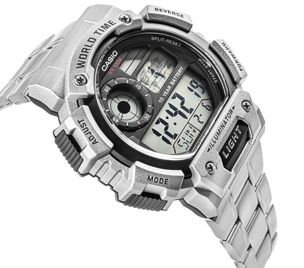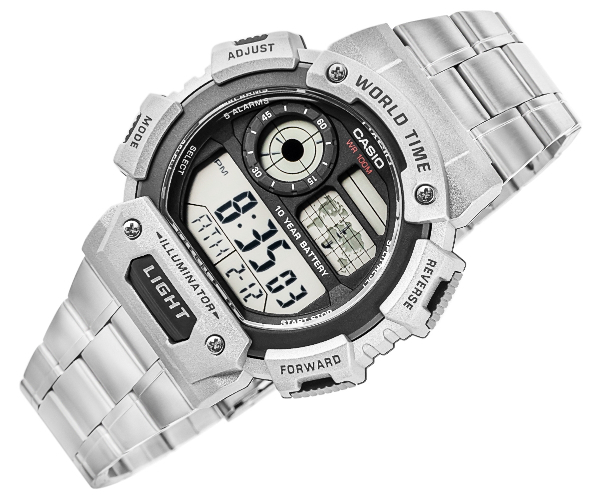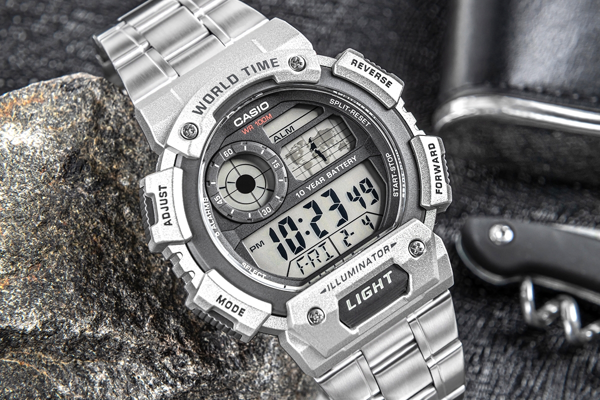 Casio AE-1400WHD-1AVDF to zegarek, który łączy sportowy charakter z nowoczesną funkcjonalnością i legendarną niezawodnością marki Casio. Wykonany z połączenia wytrzymałej żywicy i eleganckiej stalowej bransolety, prezentuje się solidnie i stylowo, a jednocześnie pozostaje lekki i wygodny w codziennym noszeniu. Jego masywna, dynamiczna forma przyciąga wzrok, a duży, czytelny wyświetlacz cyfrowy zapewnia maksymalną przejrzystość informacji. Zegarek oferuje szeroki wachlarz funkcji – dokładny czas światowy dla 48 miast, 5 alarmów dziennych, stoper 1/100 sekundy, timer odliczający do 24 godzin, automatyczny kalendarz do 2099 roku, a także możliwość wyboru formatu 12/24 h. Dzięki podświetleniu LED z funkcją afterglow tarcza pozostaje czytelna nawet w ciemności, a wodoszczelność 100 metrów pozwala swobodnie używać zegarka podczas pływania czy codziennych aktywności. Zasilany baterią o żywotności aż 10 lat, AE-1400WHD-1AVDF to model, który nie zawiedzie w żadnej sytuacji – idealny towarzysz podróży, treningów i codziennego życia. To esencja funkcjonalności w klasycznej, stalowej oprawie – zegarek dla tych, którzy cenią niezawodność, wytrzymałość i ponadczasowy styl Casio.