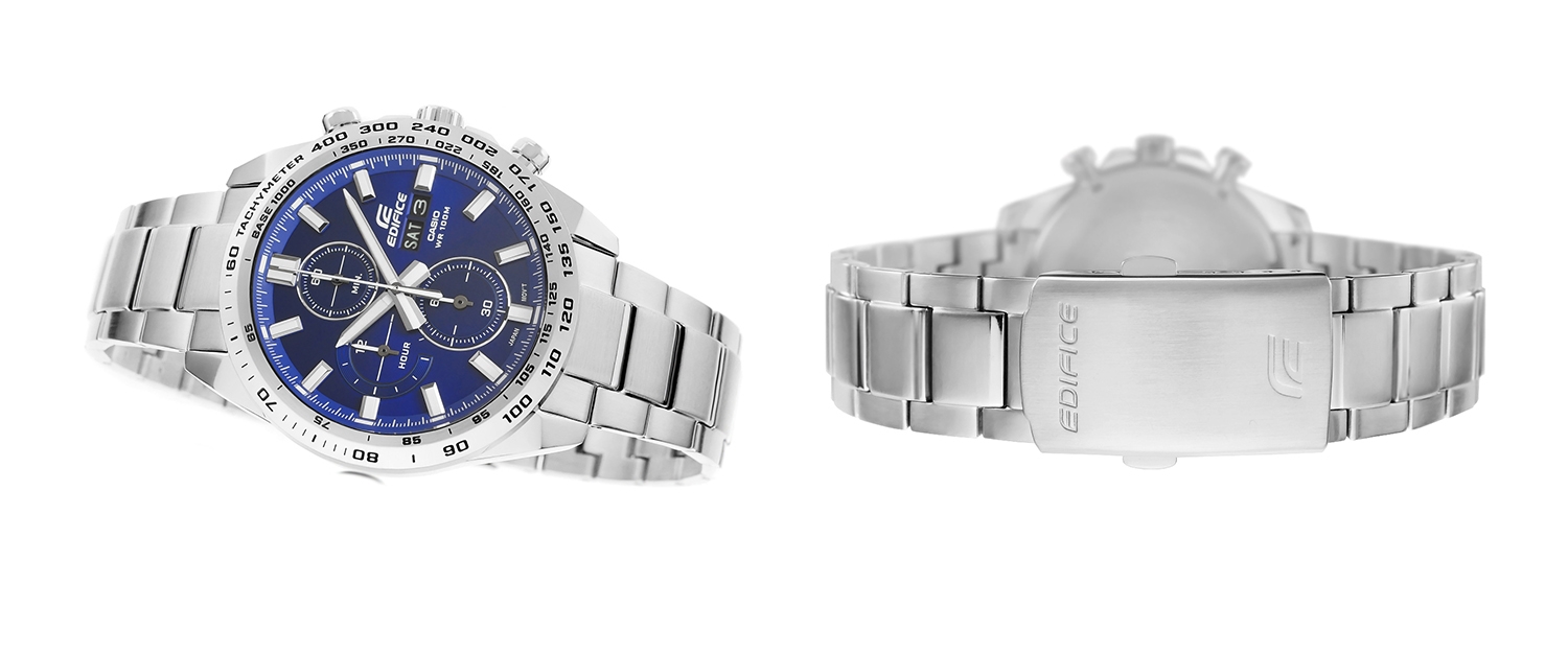 Komfortowa, stalowa bransoleta to znakomite uzupełnienie tego zegarka. Rodzaj bransolety jest gwarancją solidności i wygody podczas codziennego użytkowania. Komfort dopełnia odpowiednia jakość stali, która komfortowo dopasowuje się do męskiego nadgarstka. Zapięcie sygnowane jest logiem marki Edifice, co podnosi prestiż zegarka i zapewnia wyjątkowość na tle innych marek zegarków.