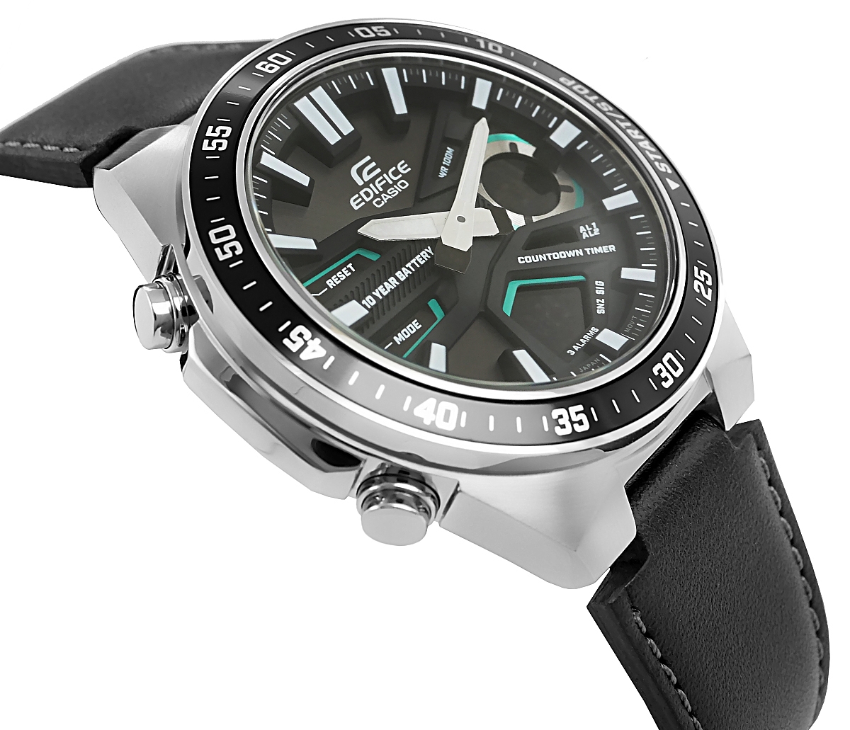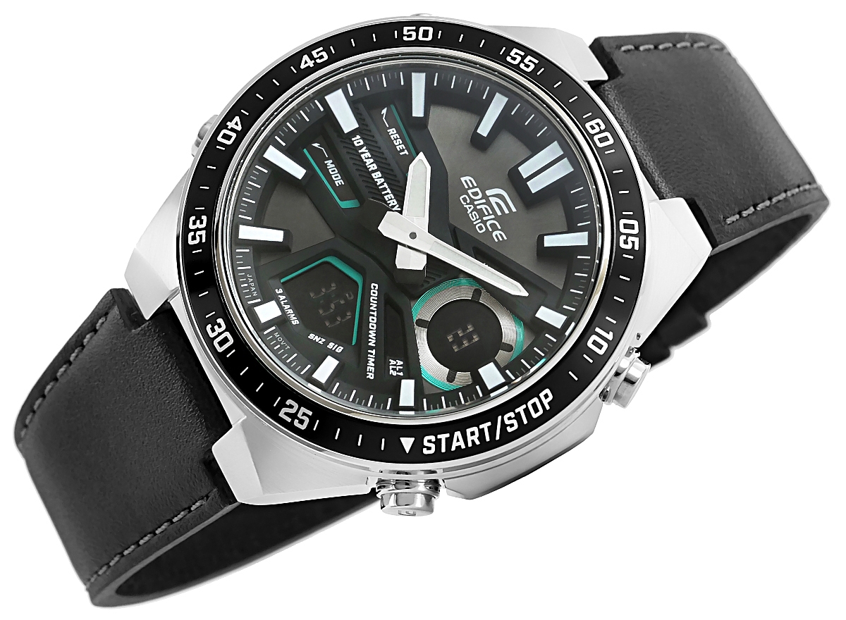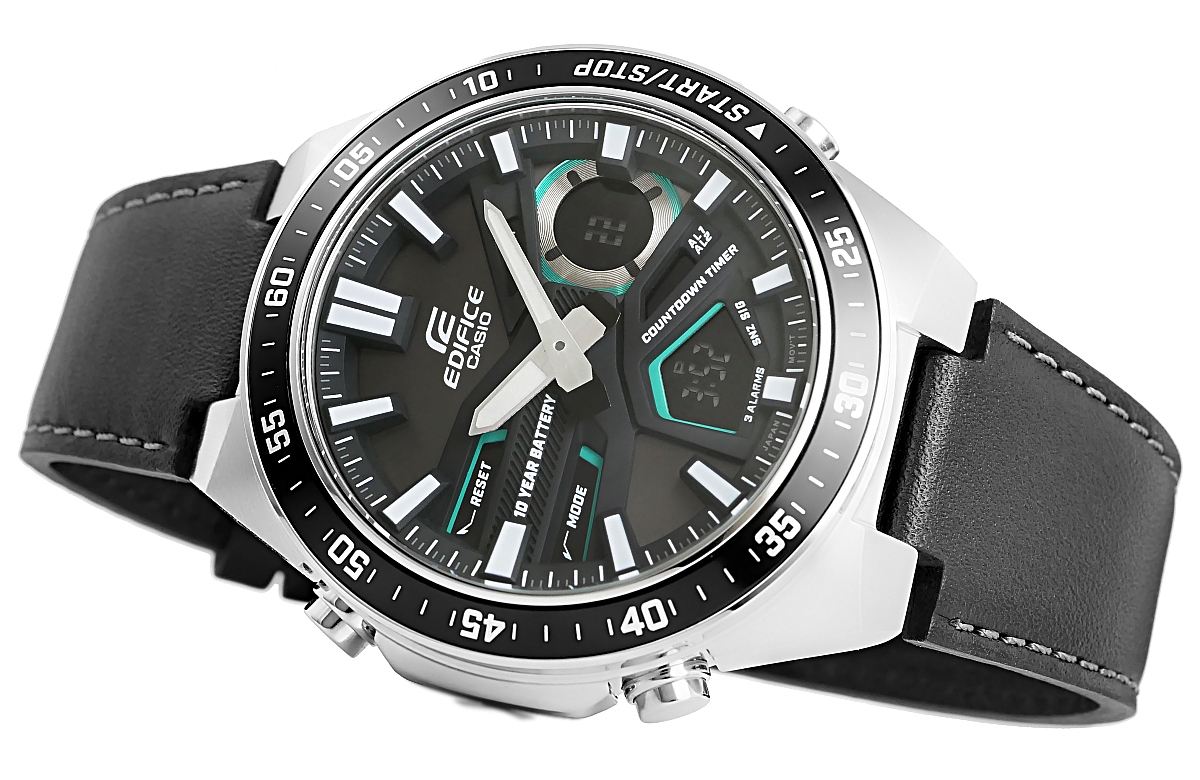 Zegarek Męski CASIO EDIFICE EFV-C110L-1AVEF wyposażony jest w działające chronografy: czas światowy- wyświetla aktualny czas w głównych miastach oraz w określonych obszarach na świecie; timer – 1/1 min. – 24 h- sygnał dźwiękowy o wybranej godzinie pozwala zapamiętać specjalne lub powtarzające się zdarzenia. Czas może być ustawiony z dokładnością do 1 minuty i do 24 godzin wcześniej. Model ten posiada dwa niezależne liczniki czasu; format 12-/24-godzinny- można ustawić wyświetlanie czasu w formacie 12- lub 24-godzinnym. W trybie 12-godzinnym na wyświetlaczu w drugiej połowie doby, tzn. od godziny 12 do 23:59, obok godziny pojawia się literka p.; funkcja drzemki- po włączeniu funkcji drzemki alarm rozlega się ponownie po kilku minutach; pamięć 30 numerów- możliwość zapisania 30 numerów telefonów, zawierających do 12 cyfr z nazwą do 8 znaków; stoper – 1/100 sek. – 24 h- dokładność pomiaru do 1/100 sekundy, zakres pomiaru do 24 h; 3 alarmy dziennie- alarm dzienny przypomina o wydarzeniach, które powtarzają się każdego dnia, emitując sygnał dźwiękowy. Ten typ alarmu pozwala na ustawianie 3 niezależnych alarmów; kalendarz automatyczny- raz ustawiony zegarek zawsze wyświetla poprawną datę (pamięta o krótszych miesiącach).