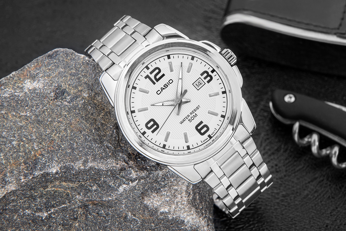 Klasyczna biała tarcza, srebrna koperta i bransoleta ze stali nierdzewnej – ten zegarek Casio łączy ponadczasową elegancję z funkcjonalnością na co dzień. Duże, czytelne cyfry arabskie, fluorescencyjne wskazówki oraz datownik sprawiają, że ten model staje się niezastąpionym towarzyszem codziennego rytmu.