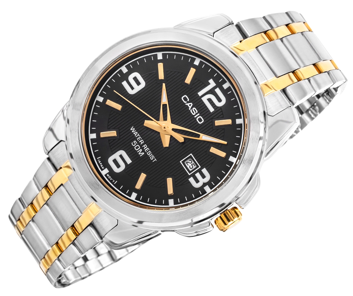 Męski model CASIO MTP-1314SG-1AVDF to idealna równowaga między elegancją a codzienną funkcjonalnością. Czarna tarcza z subtelnym żłobieniem w pionowe linie nadaje zegarkowi głębi i charakteru, a złote wskazówki i indeksy doskonale kontrastują z tłem, oferując świetną czytelność. Duże cyfry arabskie na godzinie 12, 3, 6 i 9 dodają nowoczesnego akcentu, a wbudowany datownik dyskretnie dopełnia całość. Bransoleta z połączenia stali nierdzewnej i złotych akcentów tworzy harmonijną kompozycję, która sprawdza się zarówno przy marynarce, jak i w codziennym, miejskim stylu. Koperta o klasycznych proporcjach i wodoodporność do 50M to gwarancja komfortu i trwałości w każdej sytuacji. Casio MTP – dla mężczyzny który wie, że najlepsze połączenia to te ponadczasowe.