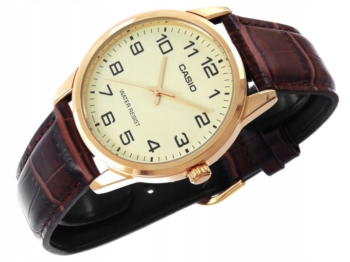 Klasyczny zegarek męski Casio z elegancką złotą kopertą i wyjątkową miodową tarczą. Brązowy pasek ze skóry naturalnej podkreśla stylowy charakter tego modelu, a czarne indeksy i złote wskazówki zapewniają doskonałą czytelność. Funkcjonalność dopełnia wodoszczelność 3 BAR, czyniąc zegarek idealnym wyborem na co dzień.