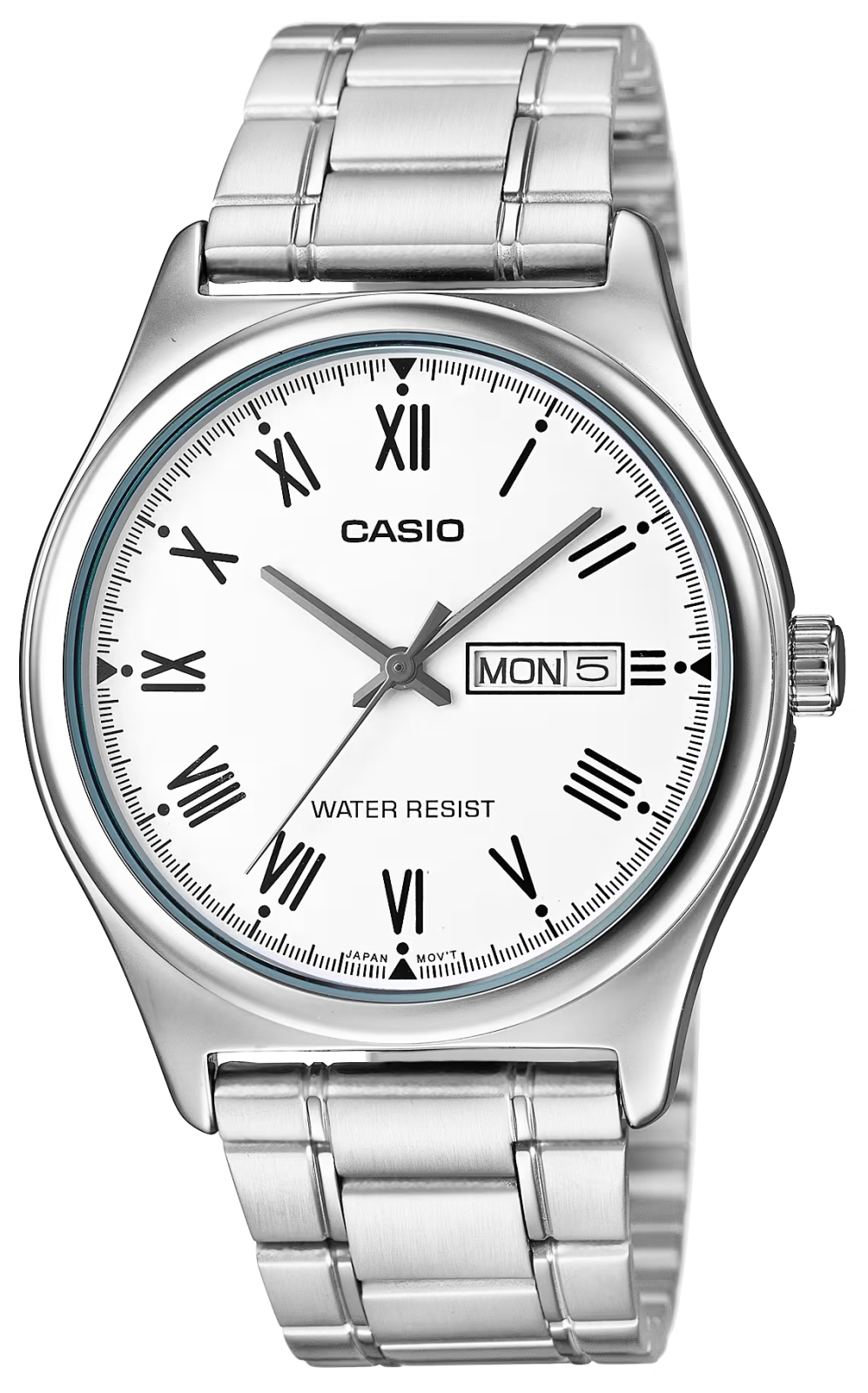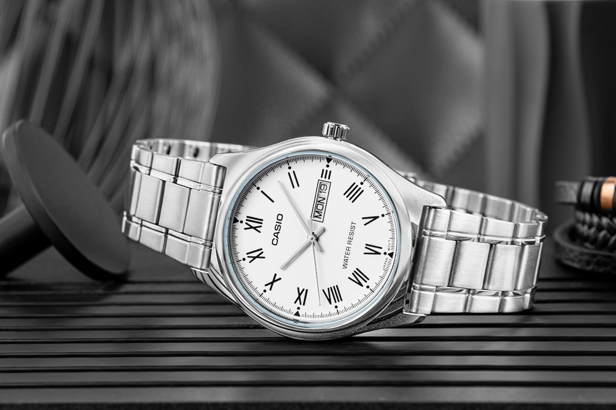 Casio MTP-V006D to model który powstał z myślą o tych, którzy cenią czystość linii i ponadczasowe wzornictwo – bez zbędnych detali, za to z pełnym szacunkiem do klasyki. Zegarek wyposażono w smukłą, 38-milimetrową kopertę oraz przejrzystą tarczę, na której osadzono delikatne wskazówki i eleganckie rzymskie indeksy. Zegarek zaprojektowany jest w oparciu o ponadczasowy układ wskazówek – godzinowej, minutowej i sekundowej, dlatego z łatwością dopasuje się zarówno do codziennych, jak i bardziej formalnych okazji. Harmonijny układ dopełnia funkcjonalny datownik na godzinie 3 – dyskretny, ale praktyczny. Całość emanuje spokojem, porządkiem i estetyką, która broni się sama. Stalowa bransoleta nadaje zegarkowi wyrafinowany charakter który odnajduje się zarówno przy mankiecie koszuli, jak i przy swobodniejszym stroju – idealny do pracy, na spotkania, jak i na co dzień.