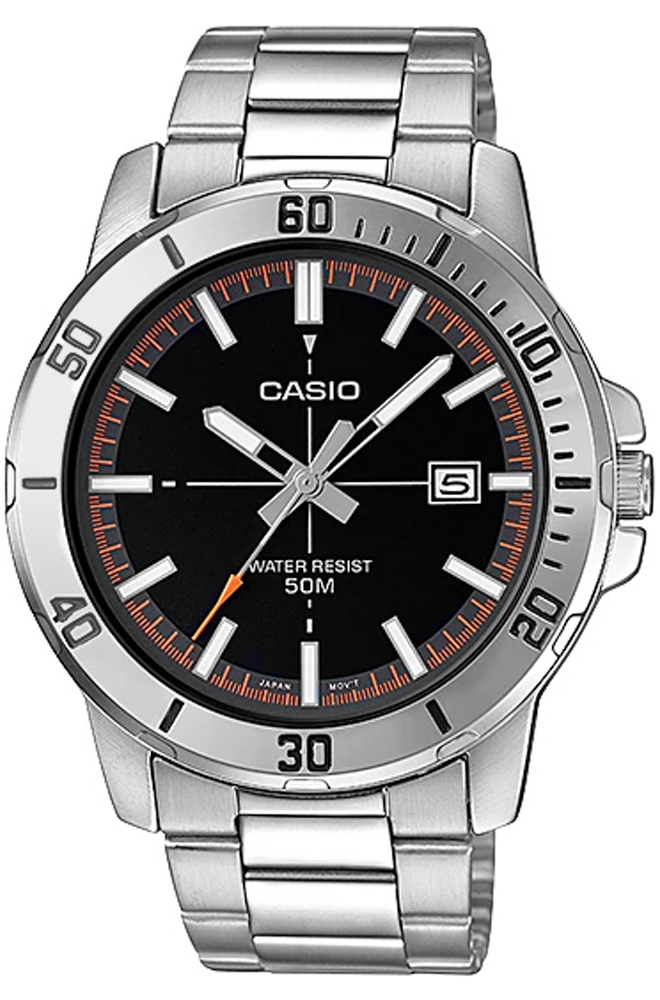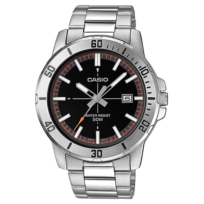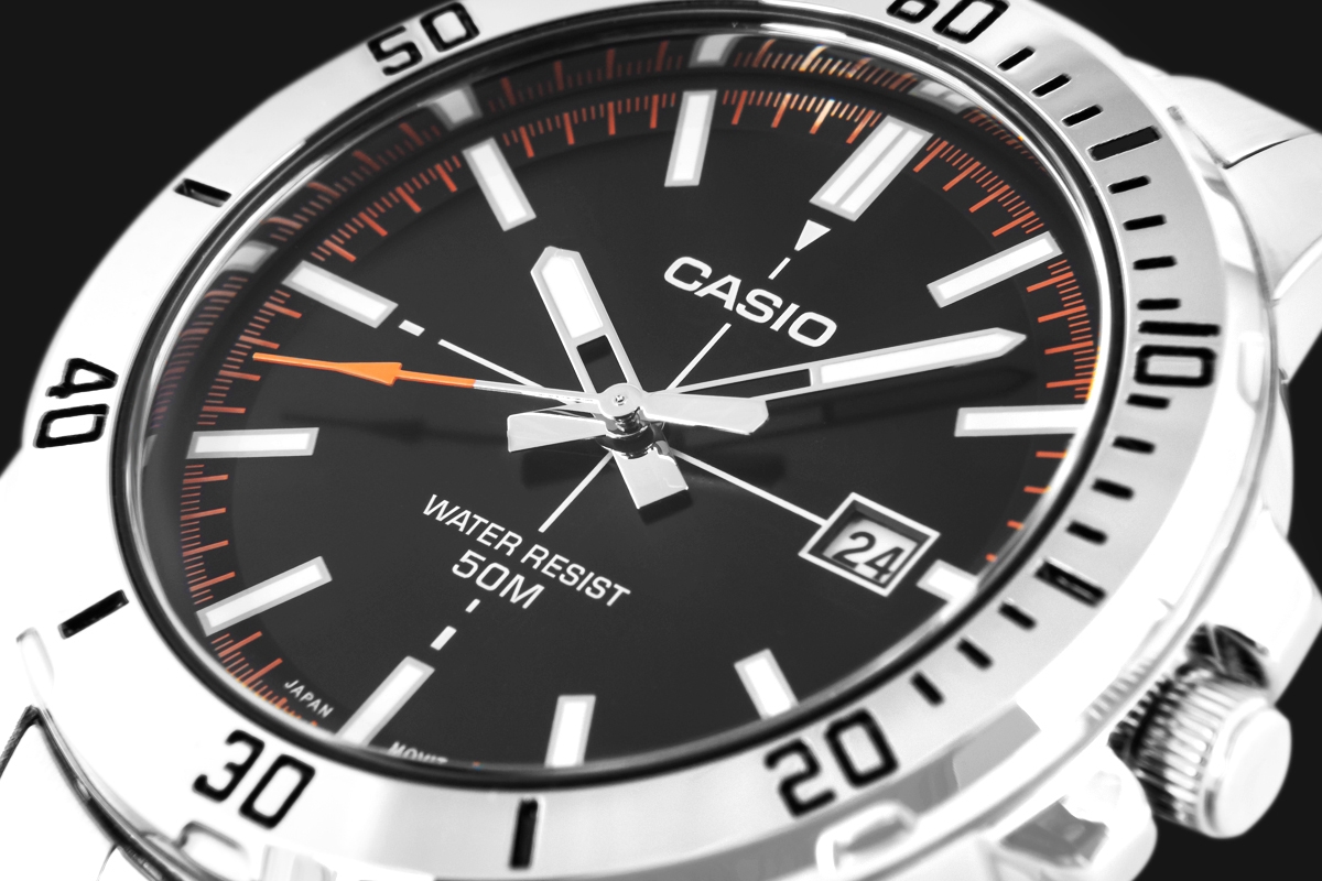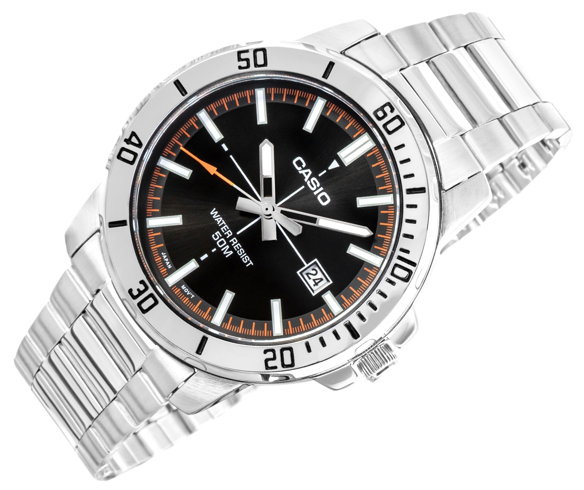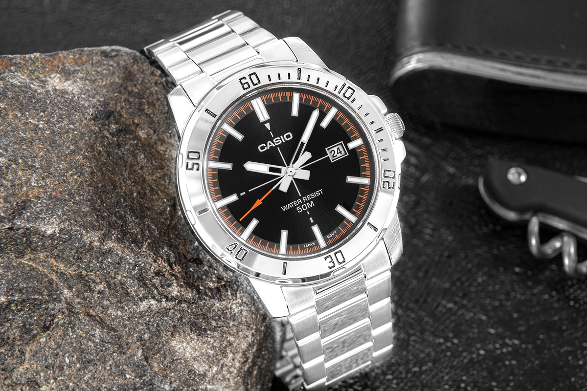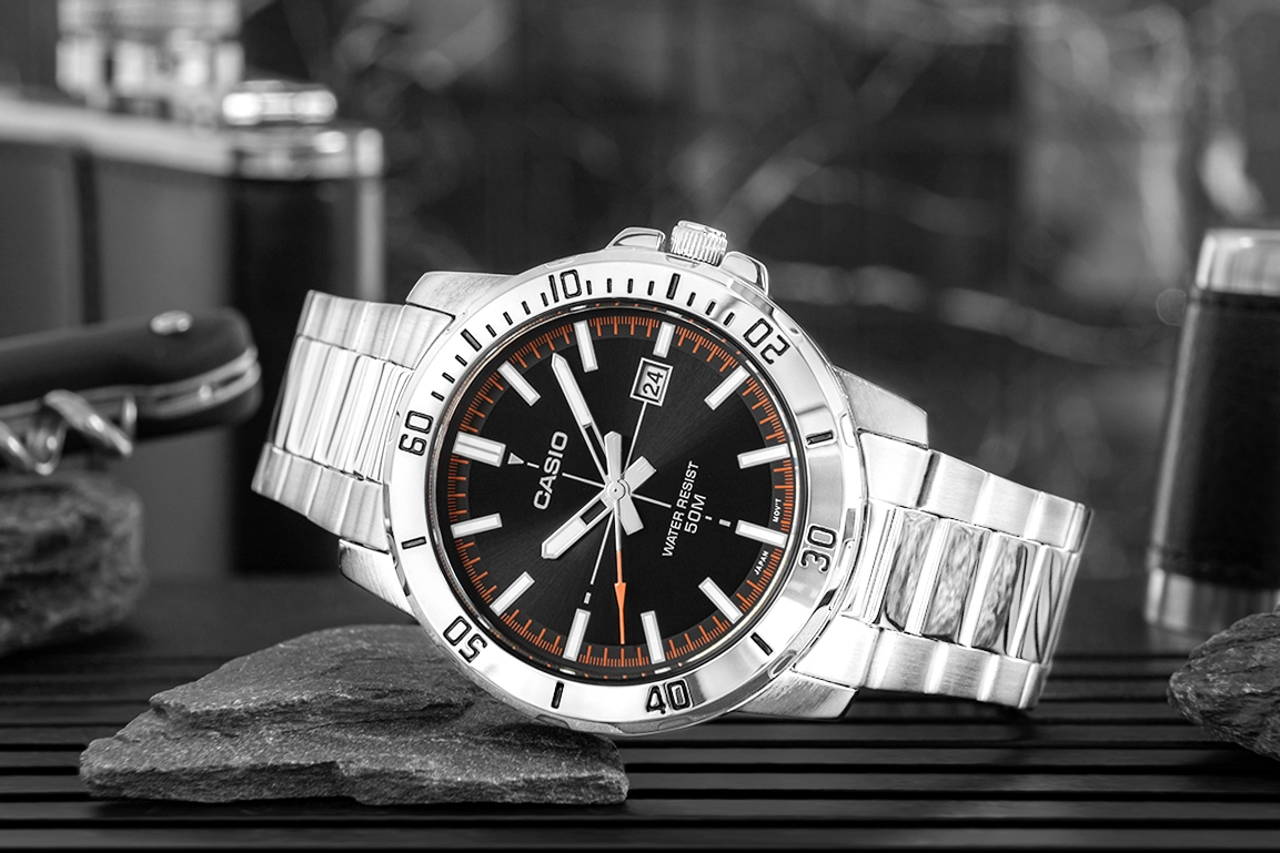 Klasyczny model CASIO który wyróżnia się solidną, 44-milimetrową kopertą ze stali nierdzewnej oraz czarną tarczą z dynamicznymi, pomarańczowymi akcentami, które nadają mu energiczny, męski charakter. Wyraźne indeksy i masywne wskazówki zapewniają doskonałą czytelność w każdej sytuacji – od porannego biegu po późne spotkanie biznesowe. Praktyczny datownik przy godzinie trzeciej oraz wodoodporność 50M czynią ten zegarek idealnym wyborem na każdy dzień – niezależnie od pogody i trybu życia. Dzięki stalowej bransolecie z klasycznym zapięciem potrójnym, model ten łączy elegancję z codzienną funkcjonalnością. Napędzany precyzyjnym mechanizmem kwarcowym, sprawdzi się u mężczyzny który ceni sobie praktyczność, trwałość i nowoczesny wygląd.