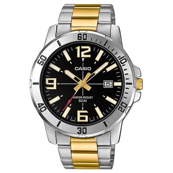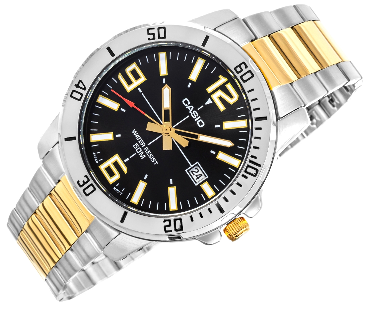 Męski model CASIO wyróżniający się wyrazistym, dynamicznym designem i solidną 44-milimetrową kopertą ze stali nierdzewnej. Czarna tarcza w połączeniu ze złotymi indeksami, masywnymi wskazówkami i detalami tworzy elegancki kontrast który podkreśla jego nowoczesny, męski charakter. Indeksy godzinowe i wskazówki pokryte są warstwą fluorescencyjną, co gwarantuje czytelność niezależnie od warunków oświetleniowych. Na wysokości godziny trzeciej znajduje się datownik w klasycznej ramce który nie tylko zwiększa funkcjonalność, ale też podkreśla równowagę kompozycji. Złoto-srebrna bransoleta ze stali nierdzewnej z eleganckim środkowym paskiem w kolorze złota idealnie dopełnia całość, zapewniając wygodę noszenia i prestiżowy wygląd. Wodoodporność 50M oznacza, że zegarek sprawdzi się zarówno w codziennym użytkowaniu, jak i podczas spontanicznych aktywności.