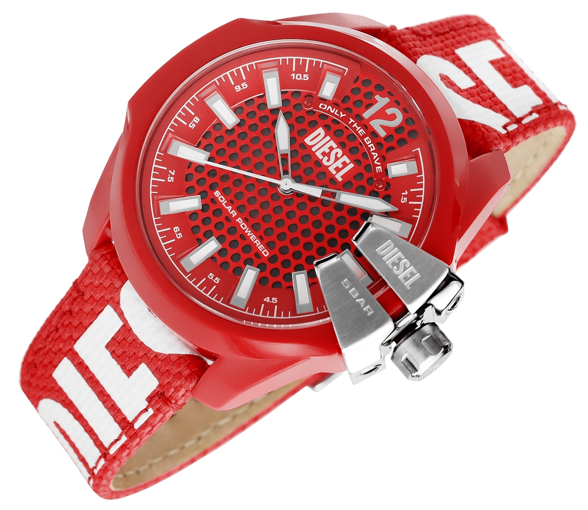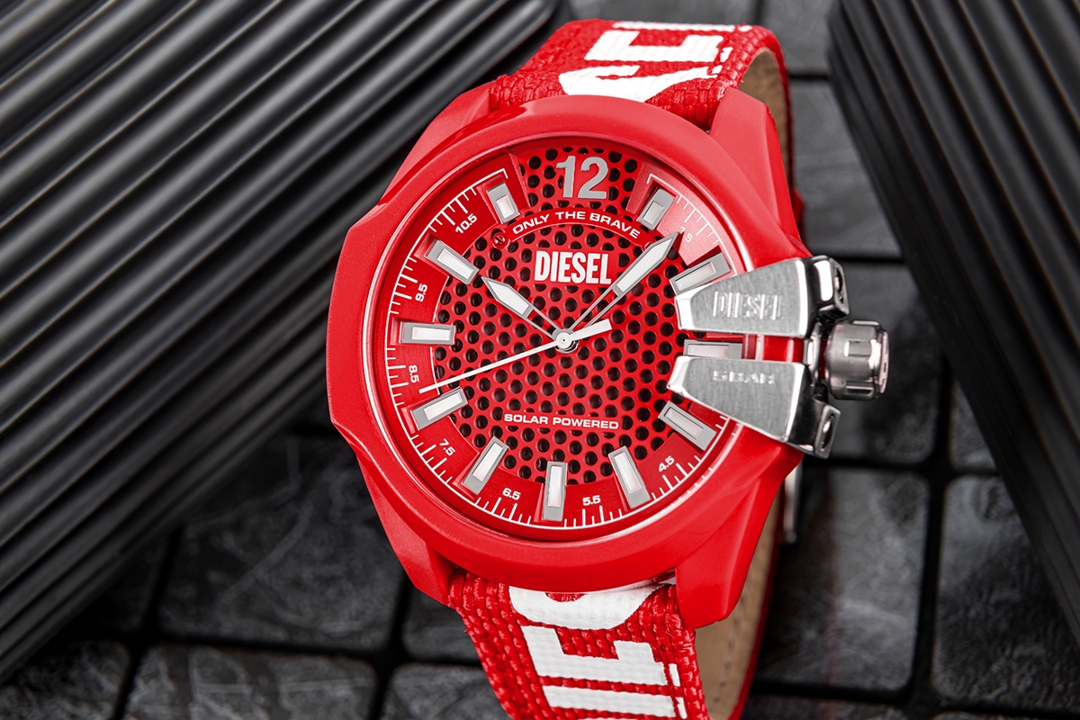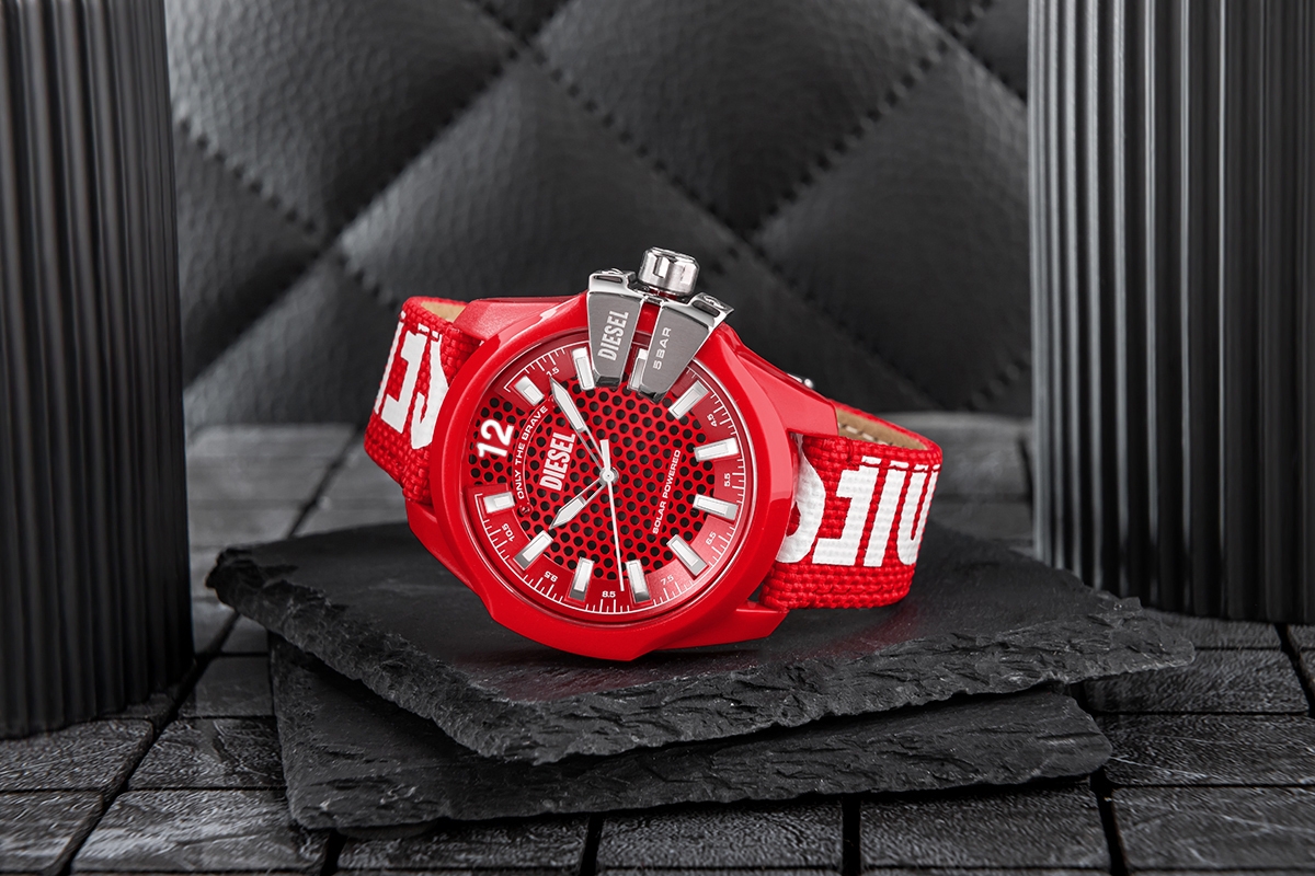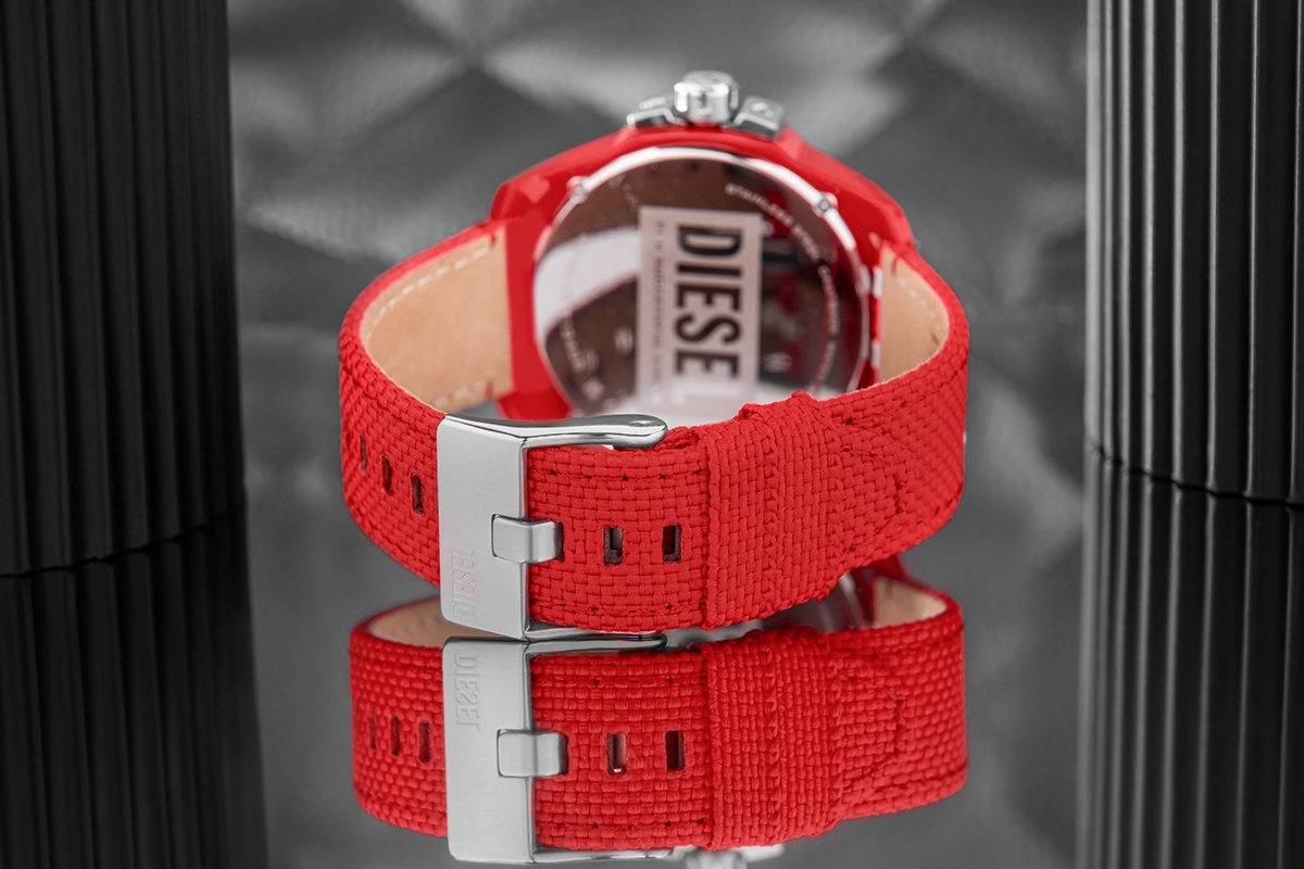 Wyrazisty i nowoczesny czasomierz wyposażony w mechanizm solarny, który czerpie energię ze światła, eliminując potrzebę wymiany baterii. Intensywna czerwień koperty i paska, uzupełniona białymi detalami, nadaje mu sportowy i dynamiczny wygląd. Unikalna perforowana tarcza w czarno-czerwonym motywie z wyraźnymi indeksami i cyfrą 12 zapewnia czytelność. Pasek wykonany z wytrzymałego materiału tekstylnego z dużym, kontrastowym logo DIESEL podkreśla streetwearowy styl zegarka.
