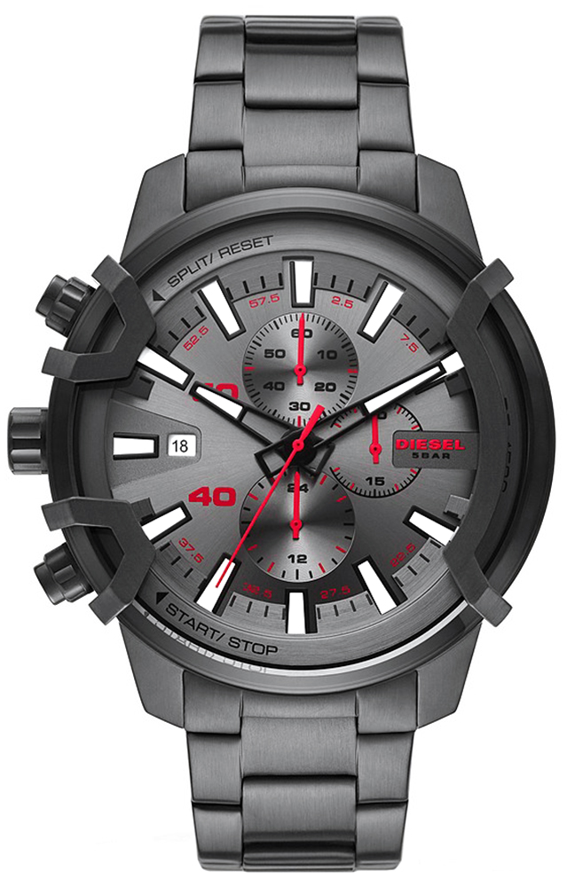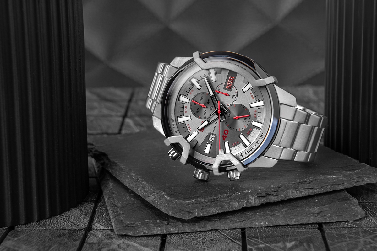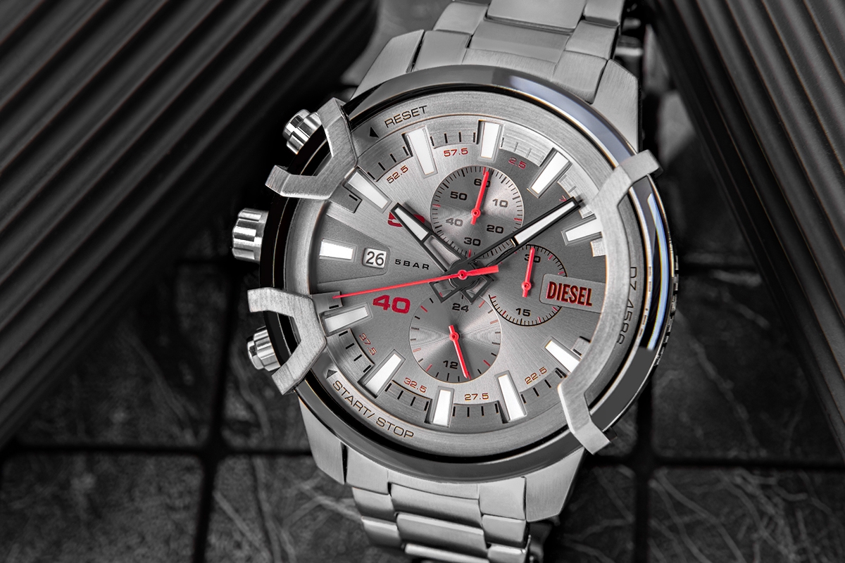 Srebrzystoszary odcień z delikatnym, szczotkowanym wykończeniem tworzy bazę, która wydobywa moc detali. Wyraziste, czerwone akcenty na wskazówkach i subtarczach wnoszą dynamikę i energię. Wysokie indeksy i elementy wystające z powierzchni tarczy nadają jej trójwymiarowego charakteru, podkreślając solidność i głębię projektu. Dzięki powłoce luminescencyjnej odczyt czasu jest możliwy nawet w słabym świetle. Maszynowy napis DIESEL wygrawerowany z boku koperty to detal, który mówi wiele o charakterze tego modelu.