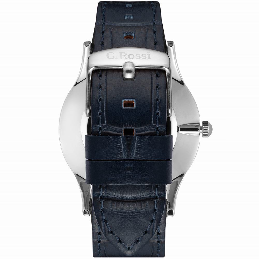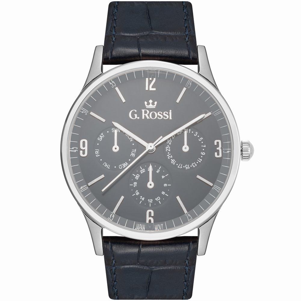 Zegarek męski G.Rossi na granatowym skórzanym pasku. Srebrne wskazówki i indeksy na granatowej tarczy z cyframi arabskimi. Średnica koperty zegarka w rozmiarze 42 mm. Uwaga! Małe zegary na tarczy stanowią funkcję ozdobną!