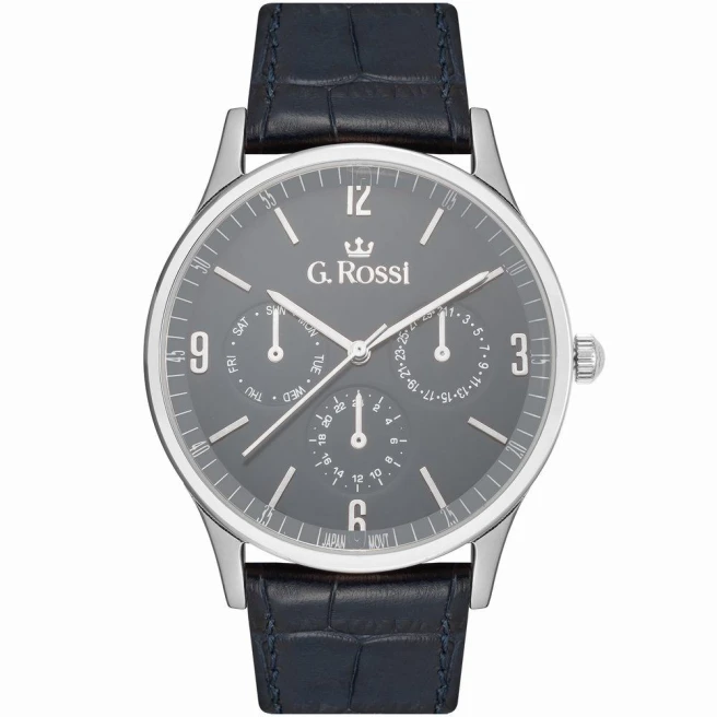 G.Rossi 10737A-6F1 to męski model na skórzanym pasku z kopertą 42 mm i czytelną tarczą z cyframi arabskimi. Całość wygląda klasycznie, ale ma trochę mocniejszą obecność niż bardzo smukłe modele garniturowe.