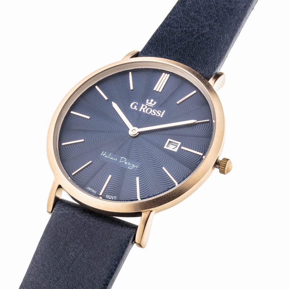 Zegarek męski G.Rossi na granatowym skórzanym pasku. Złote indeksy i wskazówki na wzorzystej granatowej tarczy z datownikiem. Złota koperta ma rozmiar 40 mm.