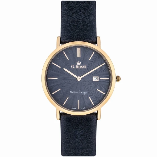 G.Rossi 10853A-6F3 to męski model na skórzanym pasku z kopertą 40 mm, smukłą linią i prostym datownikiem. Ten zegarek wygląda klasycznie i spokojnie, ale nie sprawia wrażenia ciężkiego na ręce.