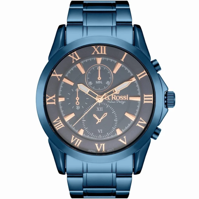 G.Rossi 3844B-6F3 to męski model na stalowej bransolecie z kopertą 45 mm i mocną, granatową kolorystyką. Ten zegarek ma bardziej wyrazisty, efektowny charakter niż spokojne klasyki na pasku.