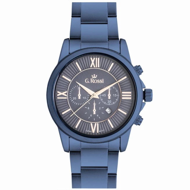 G.Rossi 6846B-6F3 to męski model na stalowej bransolecie z kopertą 42 mm i prostym datownikiem. Ten zegarek ma bardziej klasyczny odbiór niż agresywne sporty, a ozdobne małe subtarcze nie udają rozbudowanego chronografu.
