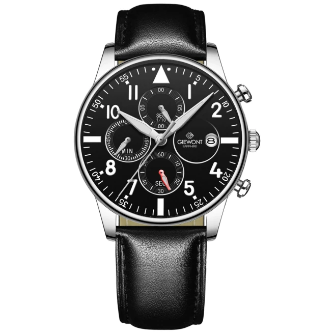 Giewont GW5630-A2 to męski zegarek Giewont z linii Chronograph Sapphire, z rozbudowaną tarczą i bardziej technicznym układem. Koperta 42 mm i układ na pasku dają mu mocniejszą obecność na nadgarstku, ale bez ciężaru typowego dla dużych diverów.