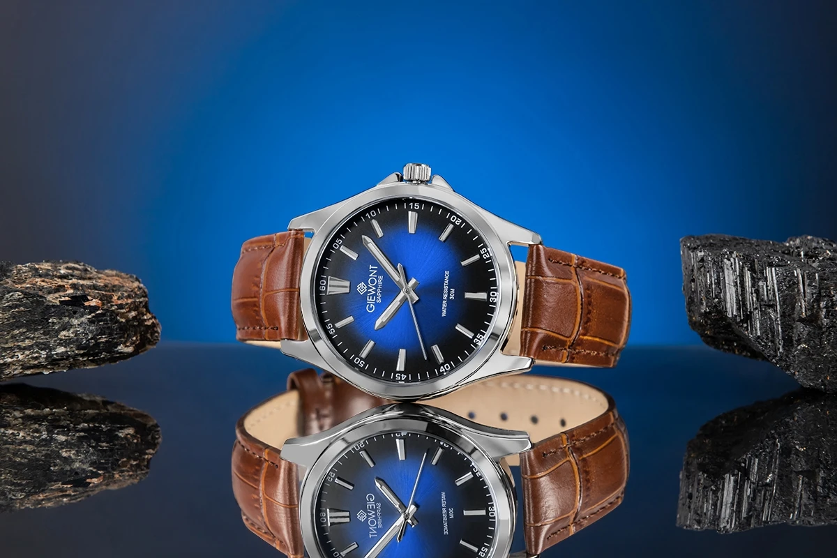 GIEWONT Elegance Sapphire to zegarek stworzony dla mężczyzn, którzy cenią sobie nienaganny styl, dobrą jakość wykonania i detale świadczące o dobrym guście. Jego głęboka, granatowa tarcza o subtelnym, promienistym gradiencie natychmiast przyciąga wzrok i nadaje całości wyjątkowego, prestiżowego charakteru, a odporne na zarysowania szafirowe szkło gwarantuje, że czasomierz zachowa swój nienaganny wygląd przez wiele lat intensywnego użytkowania. Precyzyjne, metaliczne indeksy i smukłe wskazówki zapewniają doskonałą czytelność nawet w trudnych warunkach oświetleniowych, podkreślając jednocześnie elegancki charakter zegarka. Solidna koperta w srebrnym połysku harmonijnie współgra z miękkim, klasycznym skórzanym paskiem, który idealnie dopasowuje się do nadgarstka i sprawia, że noszenie zegarka jest czystą przyjemnością. To uniwersalny, ponadczasowy model, który doskonale sprawdzi się zarówno podczas spotkań biznesowych, formalnych uroczystości, jak i w codziennych stylizacjach, dodając pewności siebie oraz wyrafinowania. GIEWONT Elegance Sapphire to nie tylko stylowy dodatek – to symbol elegancji, dbałości o detale i świadomy wybór mężczyzny, który wie, czego oczekuje od swojego czasu i od swojego stylu.