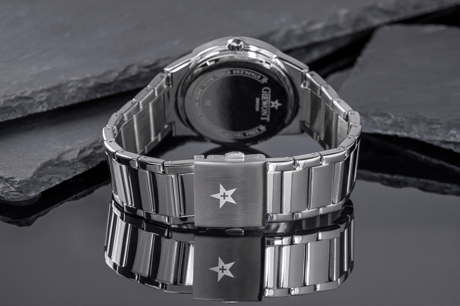 Stalowa, mocna, niezawodna, taka właśnie jest bransoleta w tym modelu zegarka marki Giewont. Wygodę i bezpieczeństwo użytkowania zapewnia stal odpowiedniej jakości, solidne ogniwa i zapięcie typu „click”, łącząc się w wyjątkowo komfortowy element tego zegarka. Srebrny kolor wyjątkowo kontrastuje z kolorem tarczy potęgując wrażenie ciekawości i unikatowości. Jeżeli pragniesz zmian, zacznij od stylowego akcesorium, który będziesz nosił z dumą i jeszcze większą pewnością siebie. |