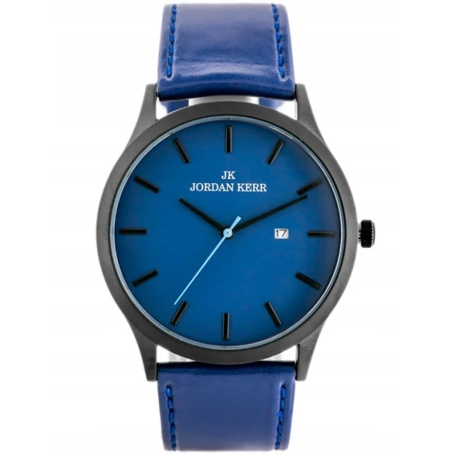 Jordan Kerr L1026-3 to duży model męski z niebieską tarczą, niebieskim skórzanym paskiem i datownikiem. Całość wypada prosto, czytelnie i bardziej sportowo niż spokojne klasyki na czarnej skórze. Koperta ma 45 mm, więc model zachowuje proporcje zgodne z tym, czego można oczekiwać po tej rodzinie.