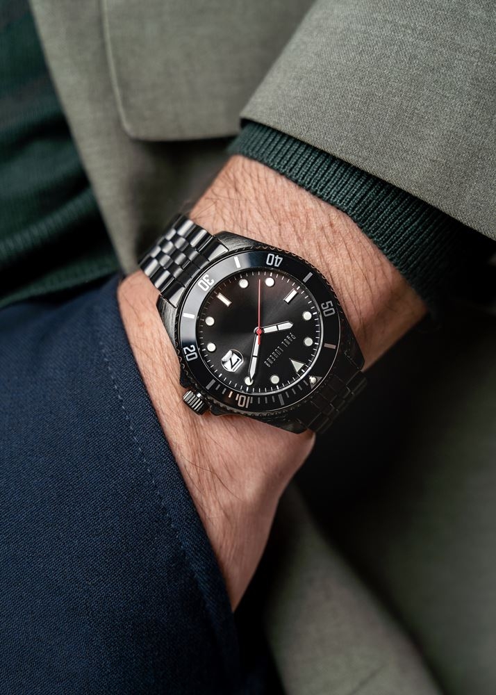 Elegancka czarna koperta z czarną tarczą oraz czerwonym sekundnikiem nadają zegarkowi wyrazisty i nowoczesny styl. Fluorescencyjne srebrne wskazówki i indeksy zapewniają doskonałą widoczność w każdych warunkach, podkreślając funkcjonalność tego modelu.
