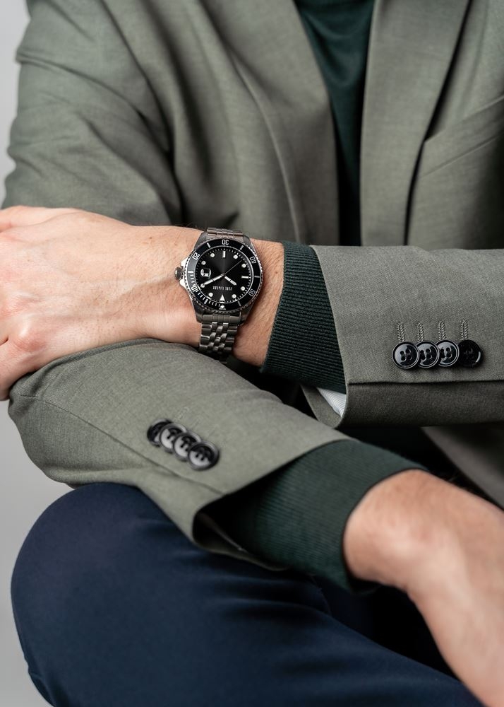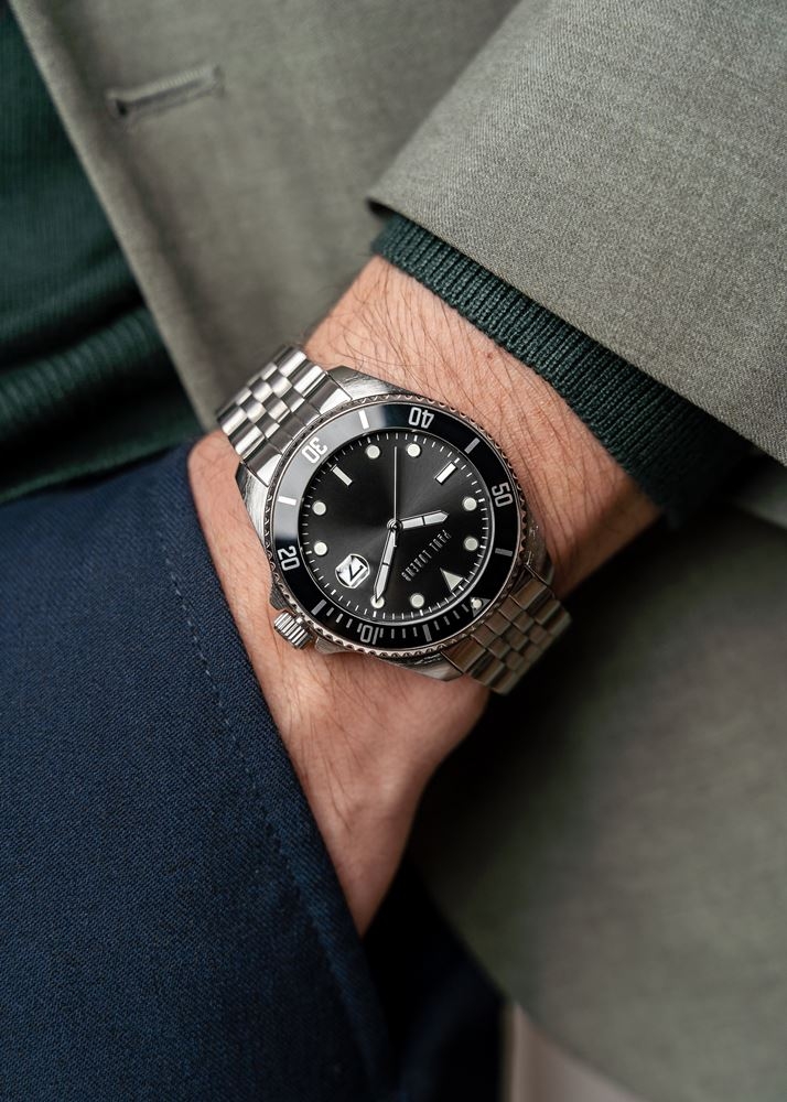 Srebrno-czarna koperta i czarna tarcza z datownikiem to połączenie stylu i praktyczności. Fluorescencyjne srebrne wskazówki i indeksy zapewniają wygodny odczyt godziny nawet w słabym oświetleniu, podkreślając uniwersalny charakter zegarka.