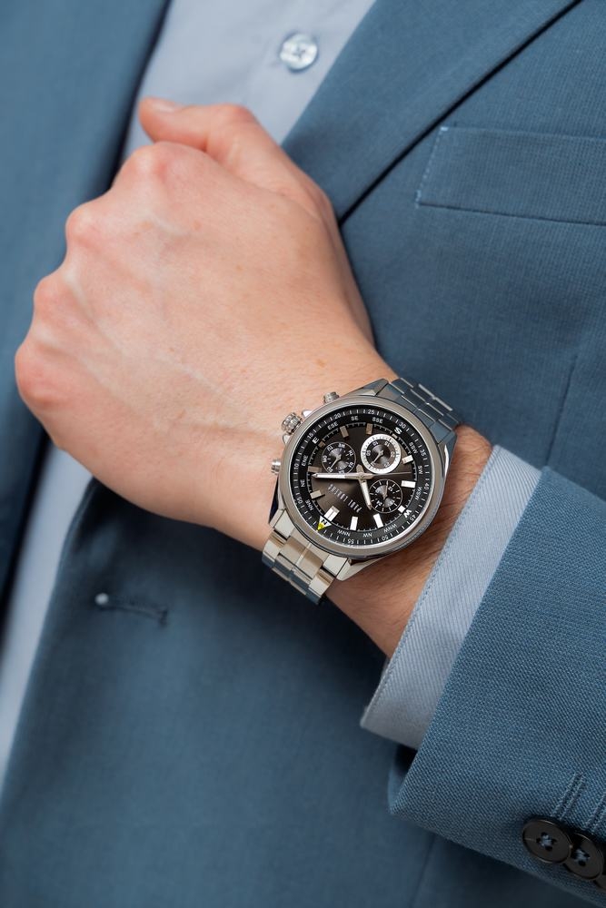 - Tarcza: Analogowa z chronografami i pierścieniem kompasowym