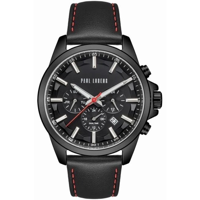 Paul Lorens PL20010A-1A3 to większy męski model na skórzanym pasku, z bardziej rozbudowaną tarczą i codzienno-eleganckim charakterem. Koperta 44 mm daje wyraźny rozmiar, ale pasek utrzymuje całość w bardziej klasycznej formie niż w cięższych zegarkach na bransolecie.