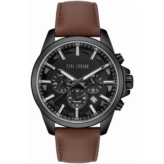 Paul Lorens PL20010A-1B2 to większy męski model na skórzanym pasku, z bardziej rozbudowaną tarczą i codzienno-eleganckim charakterem. Koperta 44 mm daje wyraźny rozmiar, ale pasek utrzymuje całość w bardziej klasycznej formie niż w cięższych zegarkach na bransolecie.