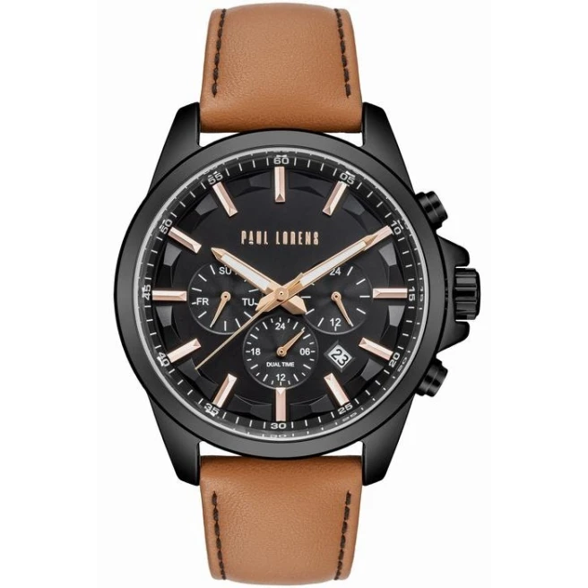 Paul Lorens PL20010A-1B3 to większy męski model na skórzanym pasku, z bardziej rozbudowaną tarczą i codzienno-eleganckim charakterem. Koperta 44 mm daje wyraźny rozmiar, ale pasek utrzymuje całość w bardziej klasycznej formie niż w cięższych zegarkach na bransolecie.