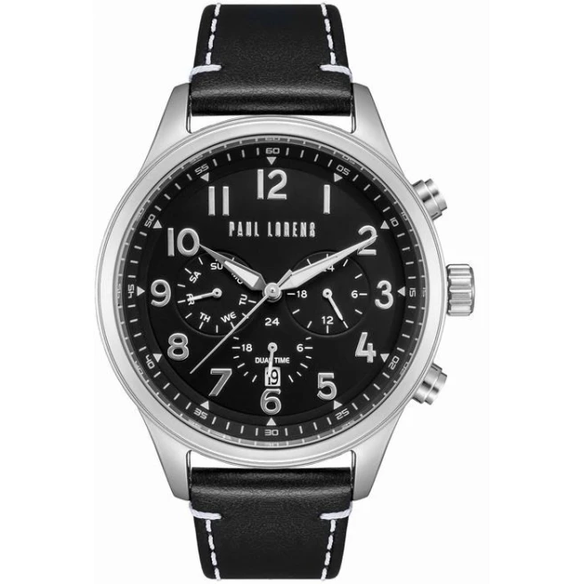 Paul Lorens PL20011A-1A1 to duży męski model na skórzanym pasku, z bardziej rozbudowaną tarczą i wyraźnie zaznaczonym codzienno-sportowym charakterem. Koperta 46 mm daje mocną obecność na ręce, ale pasek utrzymuje całość w bardziej klasycznej formie niż cięższe modele na bransolecie.