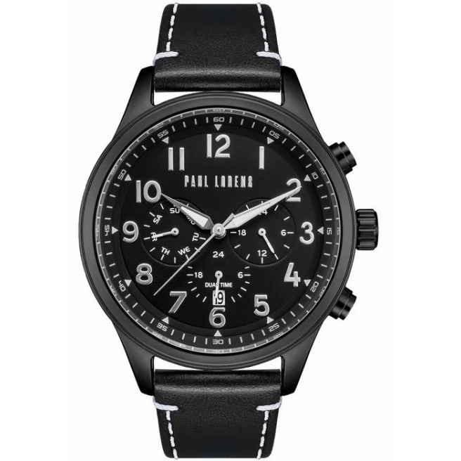 Paul Lorens PL20011A-1A5 to duży męski model na skórzanym pasku, z bardziej rozbudowaną tarczą i wyraźnie zaznaczonym codzienno-sportowym charakterem. Koperta 46 mm daje mocną obecność na ręce, ale pasek utrzymuje całość w bardziej klasycznej formie niż cięższe modele na bransolecie.