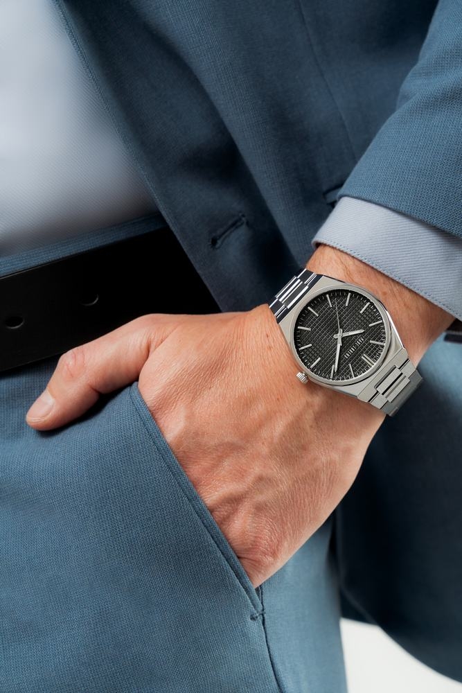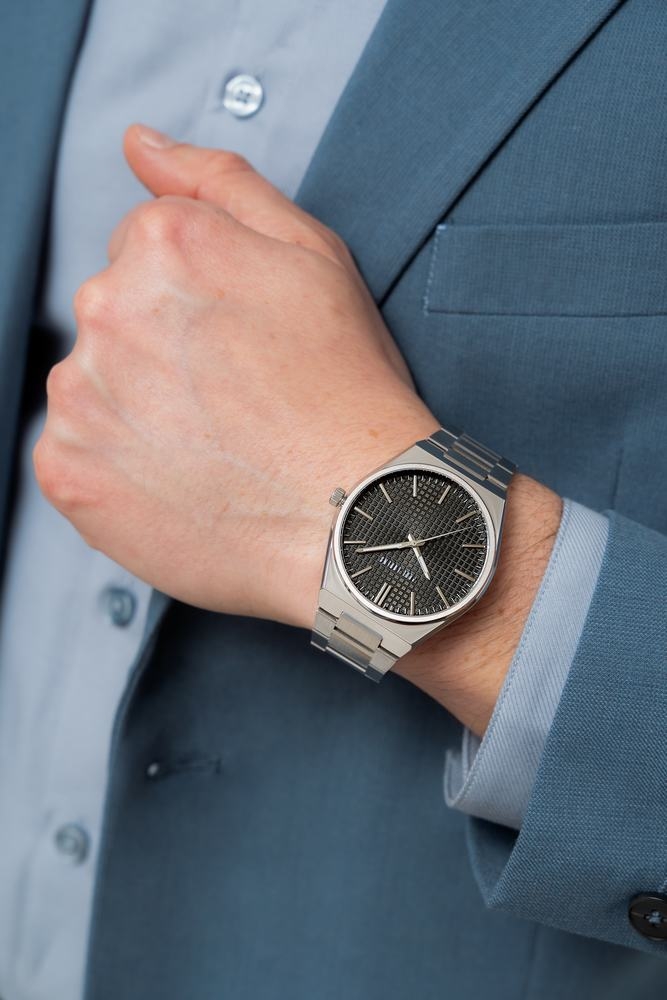Wykonana z najwyższej jakości stali nierdzewnej to połączenie niezłomnej trwałości i luksusowego wykończenia, które robi wrażenie od pierwszego spojrzenia. Jej mocna, solidna konstrukcja zapewnia niezawodność i pewność, że zegarek będzie leżeć perfekcyjnie, bez względu na to, jak wymagający będzie Twój dzień. Precyzyjnie wykonane zapięcie, opatrzone wytłoczonym logo, dopełnia ten mocny, męski charakter, dodając odrobinę elegancji i prestiżu. Wielostopniowy mechanizm zapięcia zapobiega przypadkowemu odpięciu zegarka.