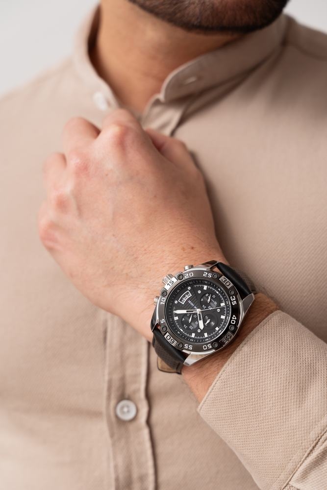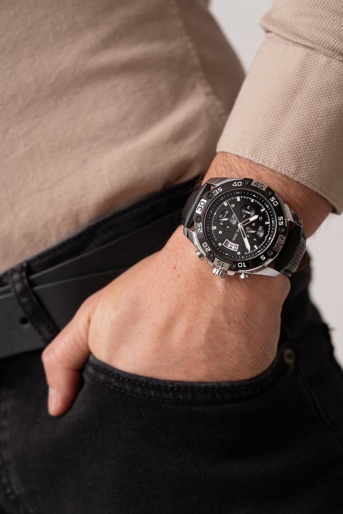 Chronografy w tym zegarku to prawdziwe mistrzostwo, które zadowoli każdego mężczyznę który ceni sobie precyzyjny pomiar czasu. Intuicyjna obsługa oraz doskonała czytelność sprawiają, że korzystanie z chronografów to prawdziwa przyjemność. Eleganckie wskazania czasu 24h, podwójnego czasu DUAL TIME, datownika dni tygodnia i miesiąca tworzą harmonijną kompozycję, dodając każdej męskiej dłoni niepowtarzalnego szyku. Przemyślane funkcje tego modelu sprawiają, że zegarek staje się nieocenionym towarzyszem w codziennym życiu, idealnie wpisując się w styl mężczyzny który ceni sobie porządek i precyzję.