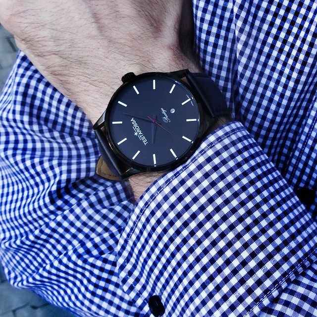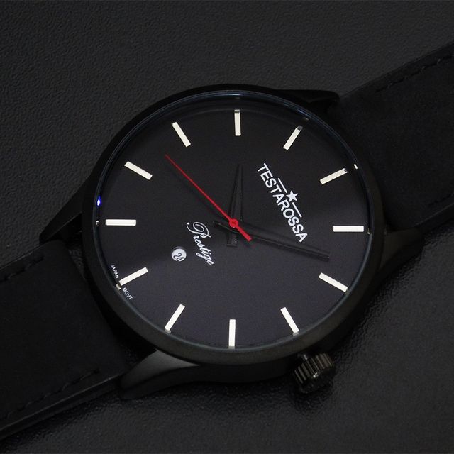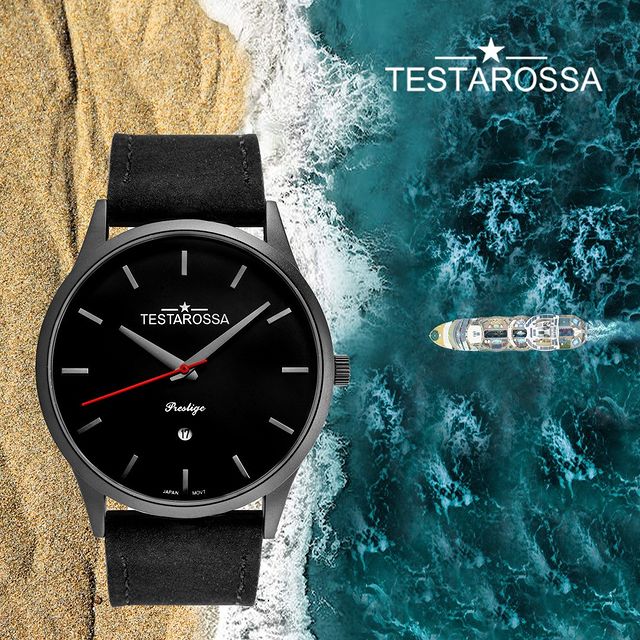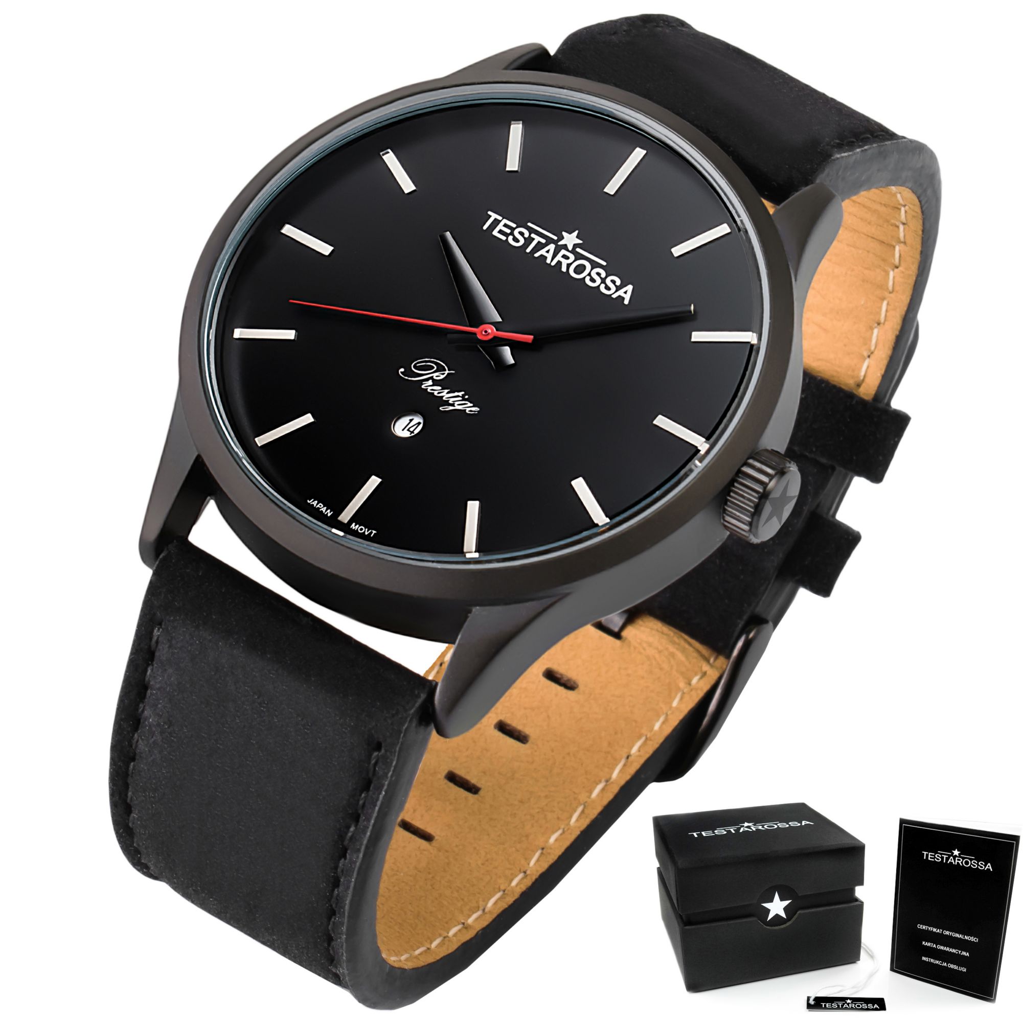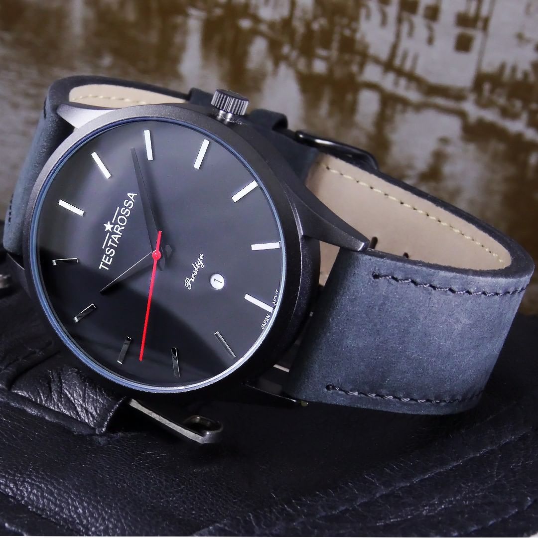 Zegarek męski z datownikiem Testarossa na czarnym skórzanym pasku.