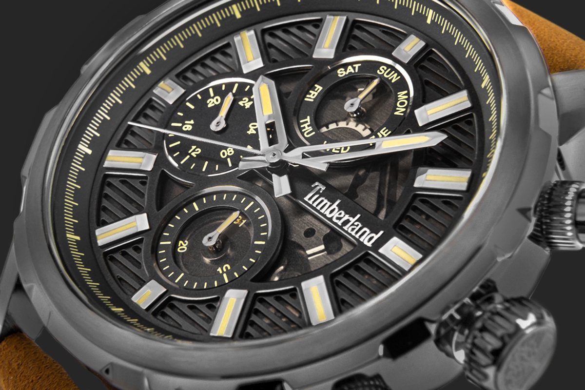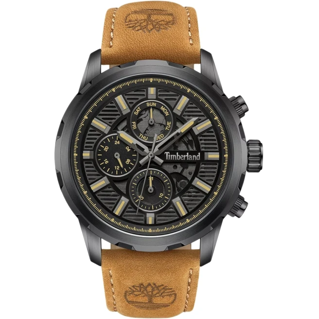 Timberland TDWGF0056101 Timberland Hampton TDWGF0056101 to większy model na skórzanym pasku, z rozbudowaną tarczą i wskazaniem 24h. Koperta 46 mm daje mocny, codzienny format, a dodatkowe wskazania podbijają użytkowy charakter zegarka.
