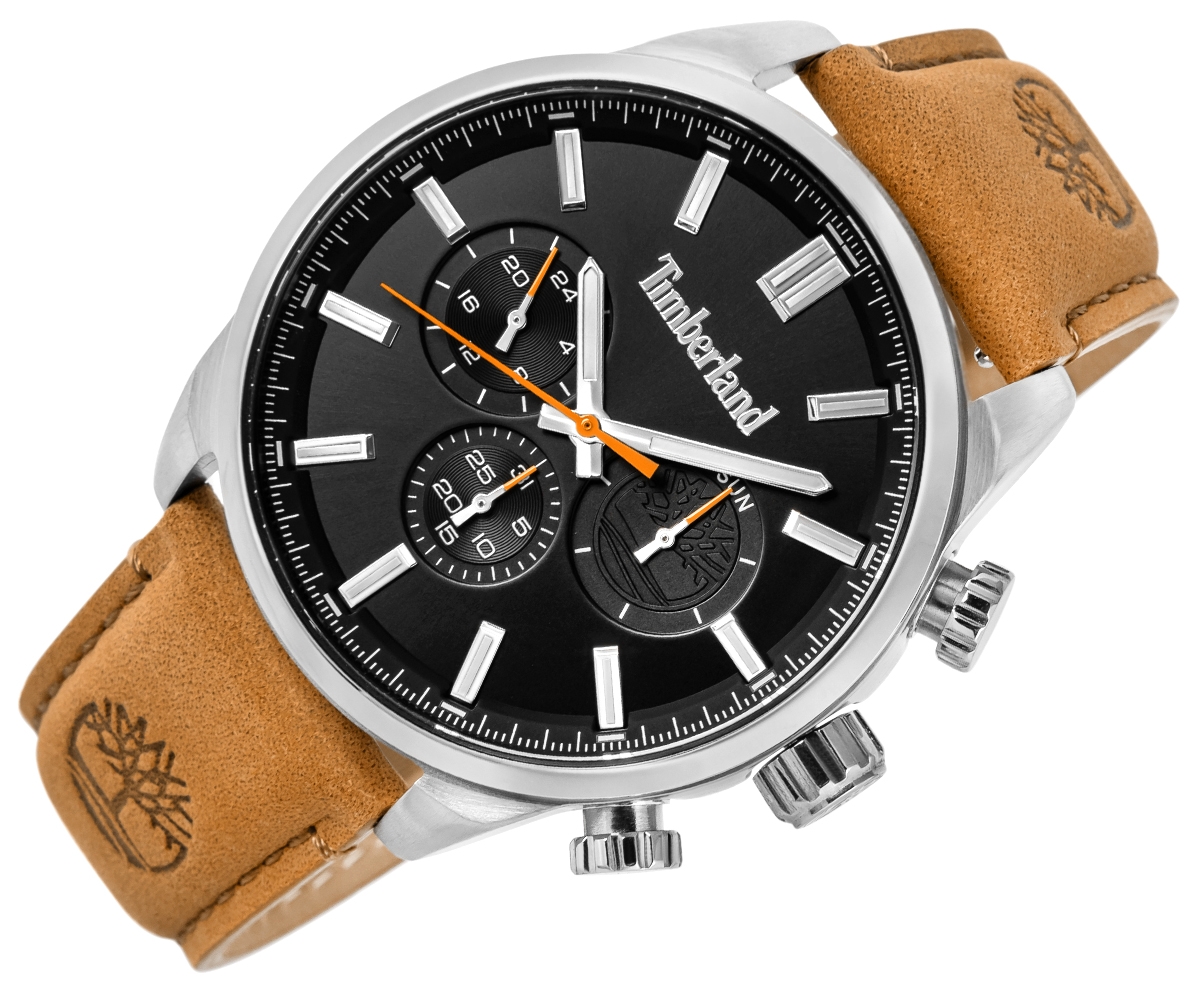 Timberland TDWGF0028701 Timberland Henniker II TDWGF0028701 to większy model na skórzanym pasku, z rozbudowaną tarczą i wskazaniem 24h. Koperta 46 mm daje mocny, codzienny format, a dodatkowe wskazania podbijają użytkowy charakter zegarka.