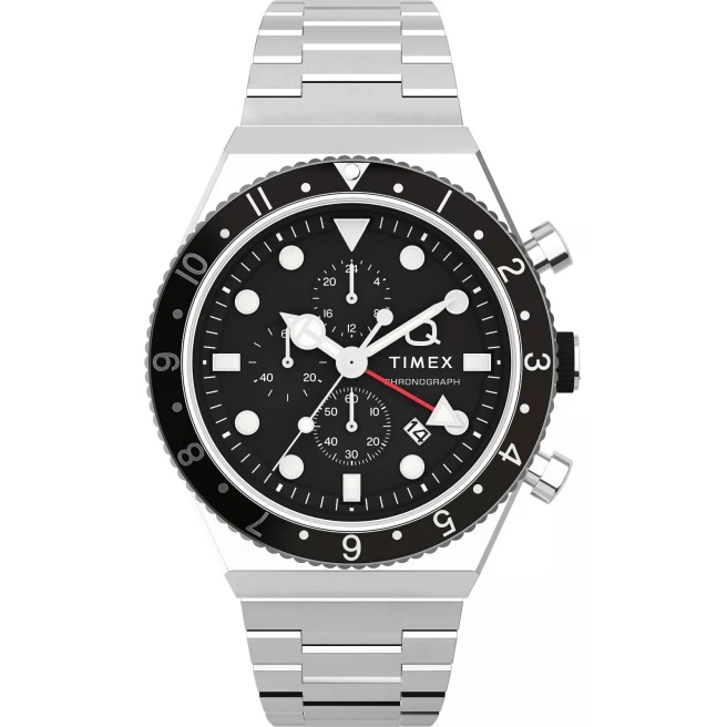 TIMEX TW2V69800 to bardziej rozbudowana odsłona serii Q, z chronografem i możliwością śledzenia kilku stref czasowych. Koperta 40 mm i stalowa bransoleta utrzymują sportowy, techniczny charakter, ale cały model dalej wyraźnie siedzi w retro estetyce linii Q.