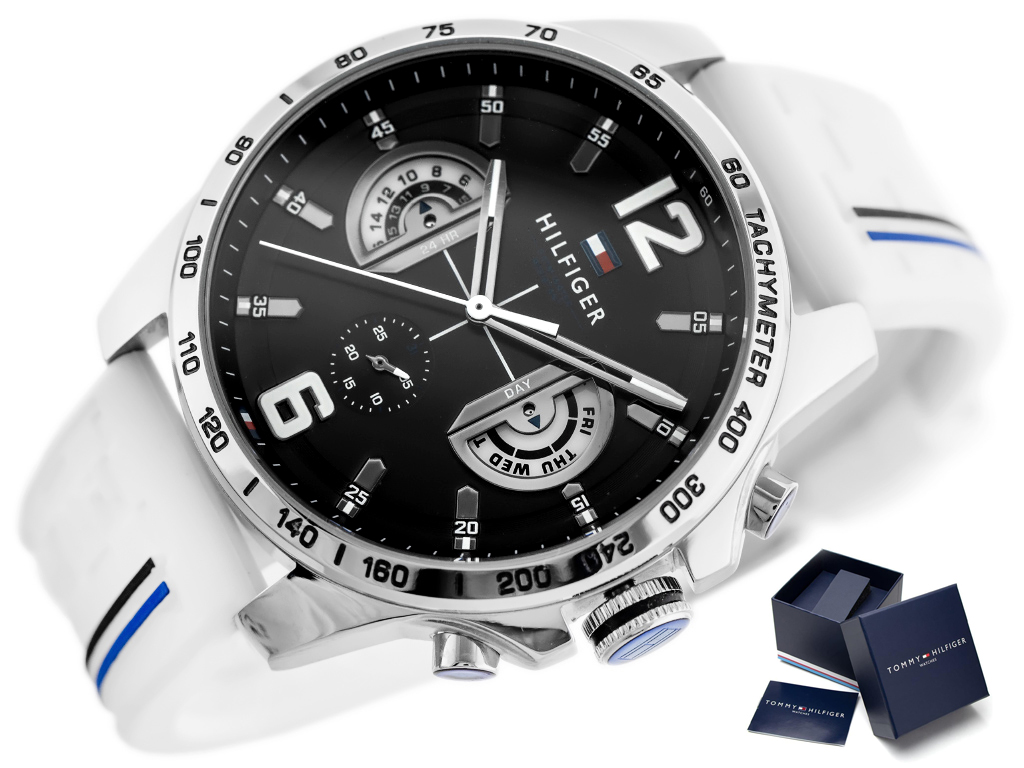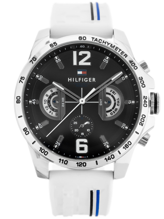 Zegarek męski TOMMY HILFIGER 1791475 to nowoczesne połączenie wygody i sportowego stylu na co dzień. Koperta zegarka wykonana jest ze stali szlachetnej w kolorze srebrnym, a biały pasek zrobiony jest z trwałego tworzywa sztucznego. Pasek jest zdobiony sygnaturą projektanta oraz dodatkowymi paskami w kolorze czarnym i niebieskim. Czarna tarcza zawiera logo marki oraz datownik pokazujący dzień miesiąca i nazwę dnia tygodnia. Zegarek posiada funkcje tachometru i czasomierza 12/24h, a dodatkowo ma wodoszczelność na poziomie 5 ATM, co oznacza odporność na zachlapania, mycie rąk bez zanurzania.