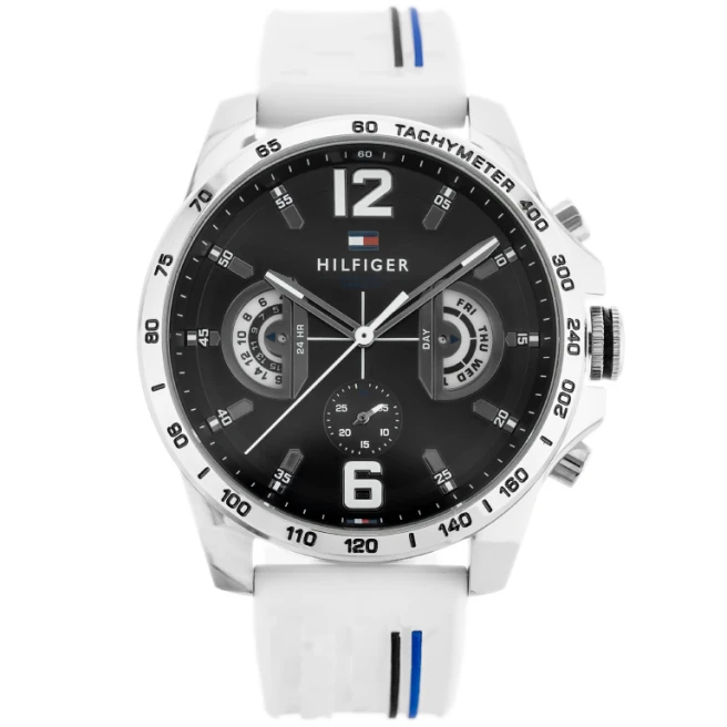 Tommy Hilfiger Decker 1791475 to jedna z najbardziej sportowych odsłon tej serii. Grafitowa tarcza, biały silikonowy pasek i większa koperta 46 mm dają mocny kontrast i bardziej swobodny charakter.
