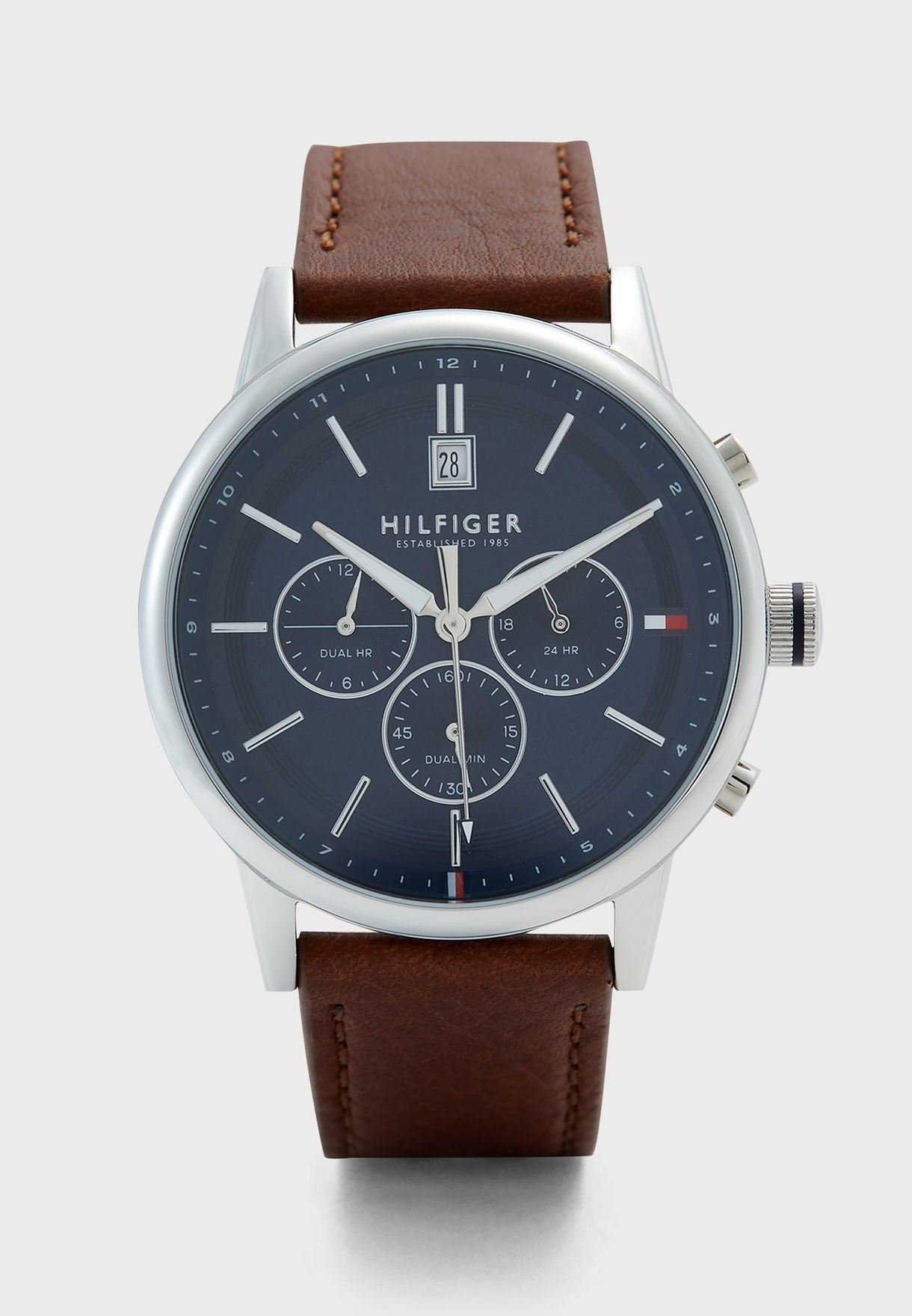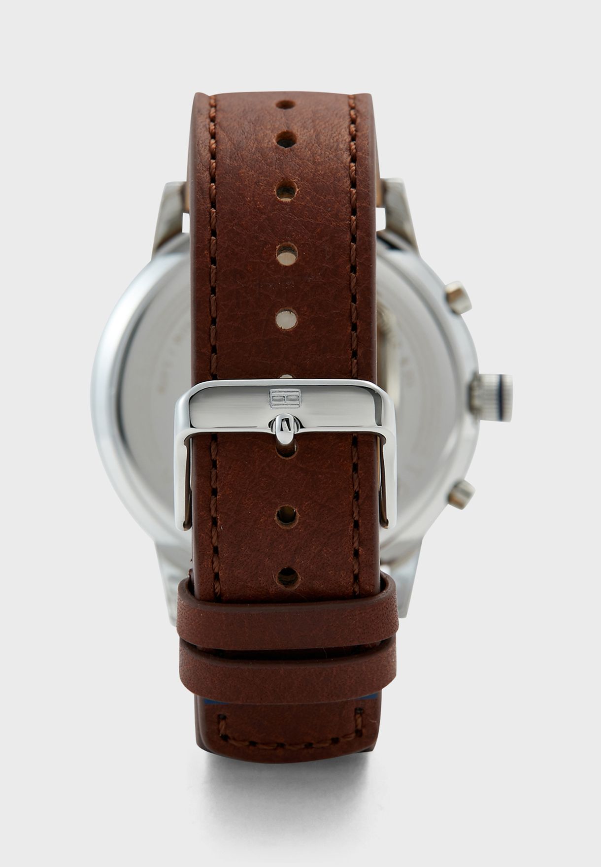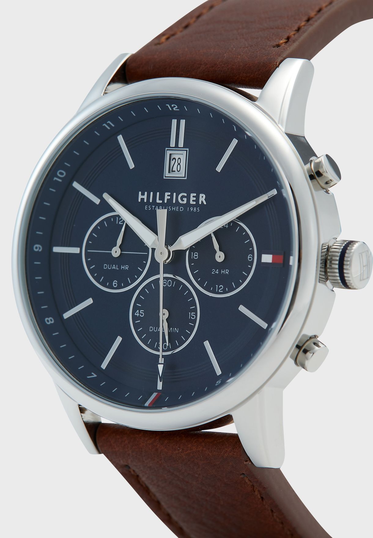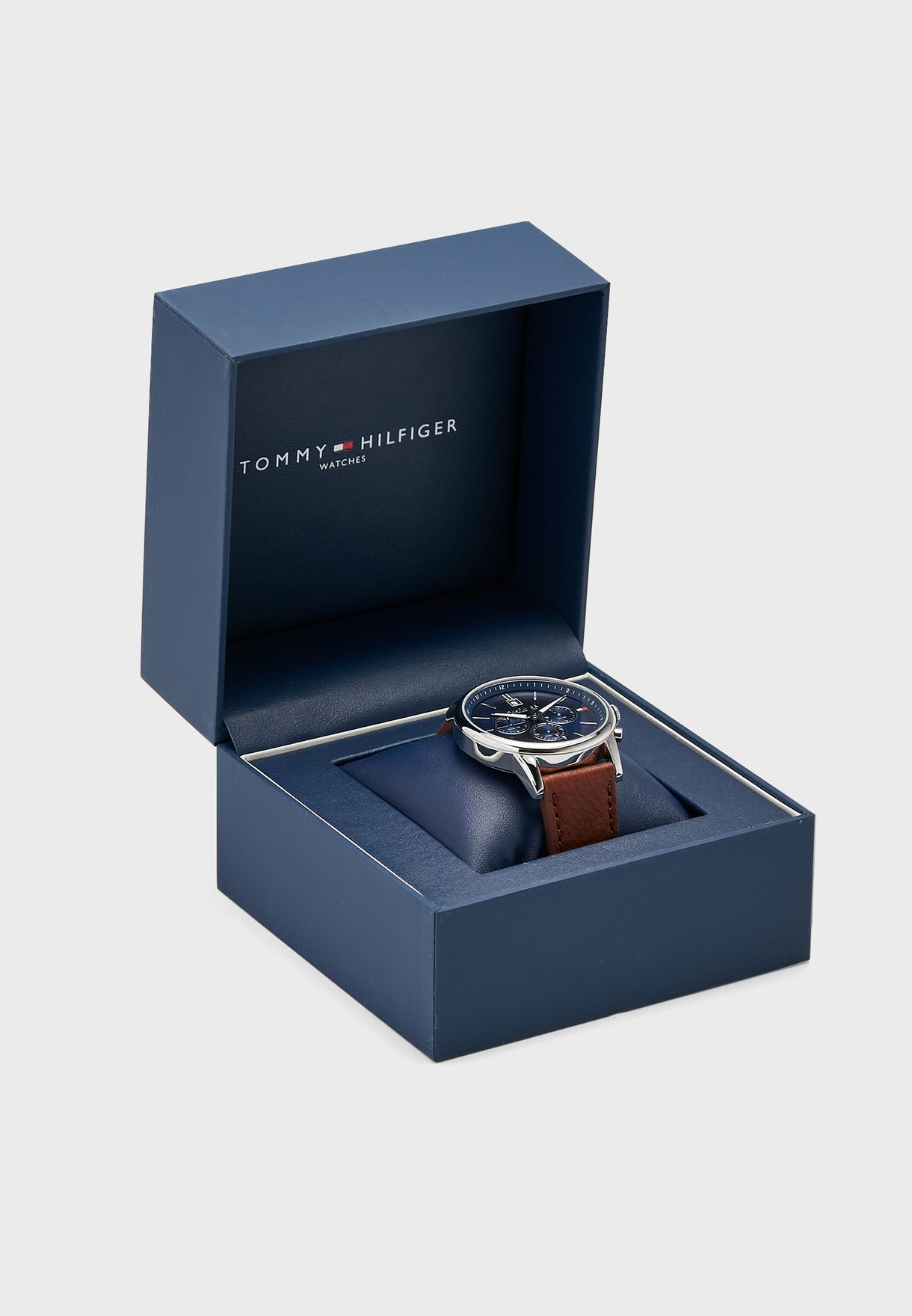 Zegarek męski marki Tommy Hilfiger na brązowym skórzanym pasku. Srebrne indeksy, fluorescencyjne wskazówki i sekundnik na granatowej tarczy z chronografami i datownikiem. Srebrna koperta zegarka o średnicy 44 mm.