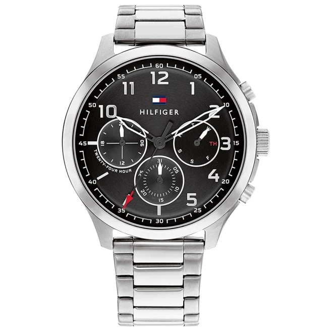 Tommy Hilfiger Asher 1791852 stawia na prosty, wyraźny kontrast – czarna tarcza, srebrna bransoleta i stalowa koperta. To model, który wygląda nowocześnie i konkretnie, ale nadal jest łatwy do noszenia na co dzień.