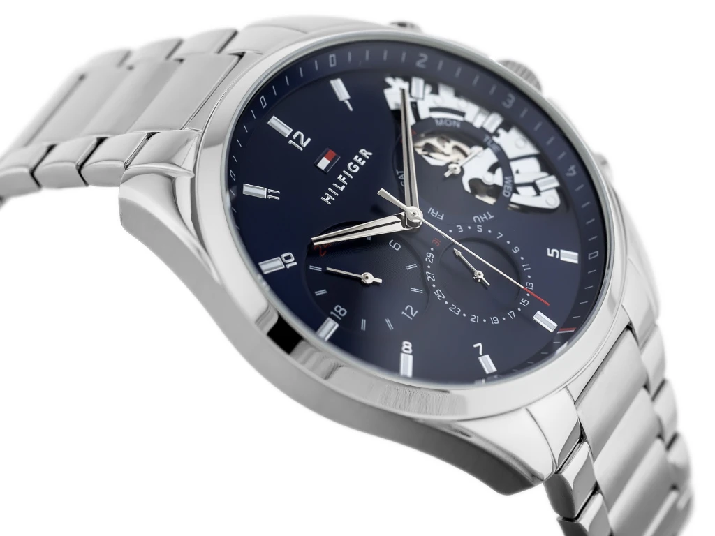 Tommy Hilfiger 1710448 Baker łączy niebieską półotwartą tarczę z srebrną stalową bransoletą. Model ma wskazanie dnia tygodnia, dnia miesiąca i czasu 24h, mineralne szkło i wodoszczelność 5 ATM.