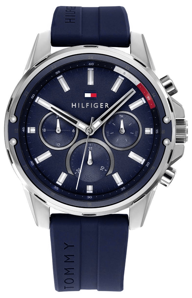 Elastyczny silikonowy pasek z wytłaczanym logo Tommy Hilfiger jest wygodny, trwały i łatwy w czyszczeniu, co czyni go idealnym wyborem dla aktywnych mężczyzn.