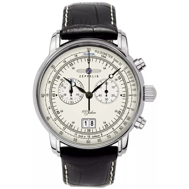 Zeppelin 7690-1 to model z jubileuszowej serii 100 Jahre, ale w spokojniejszej, bardziej klasycznej odsłonie niż warianty alarmowe. Jasna tarcza, skórzany pasek i lotnicze skale dobrze łączą retro klimat z codzienną czytelnością.