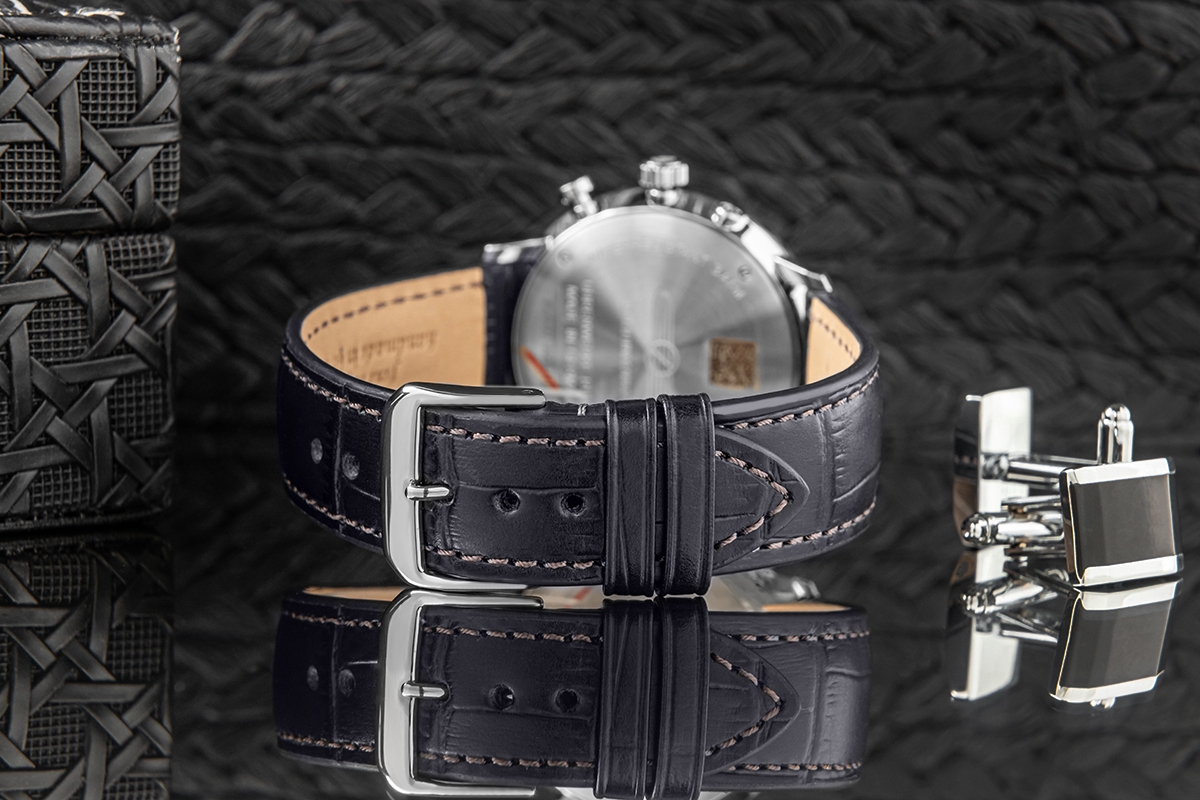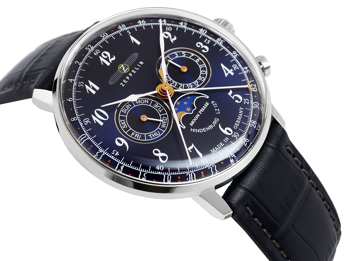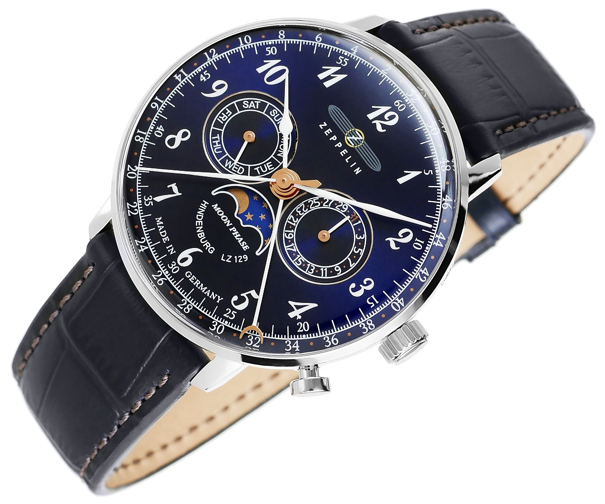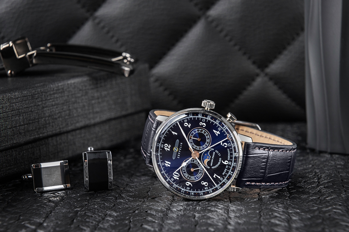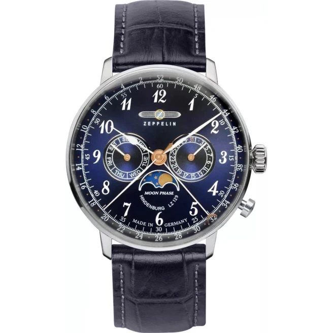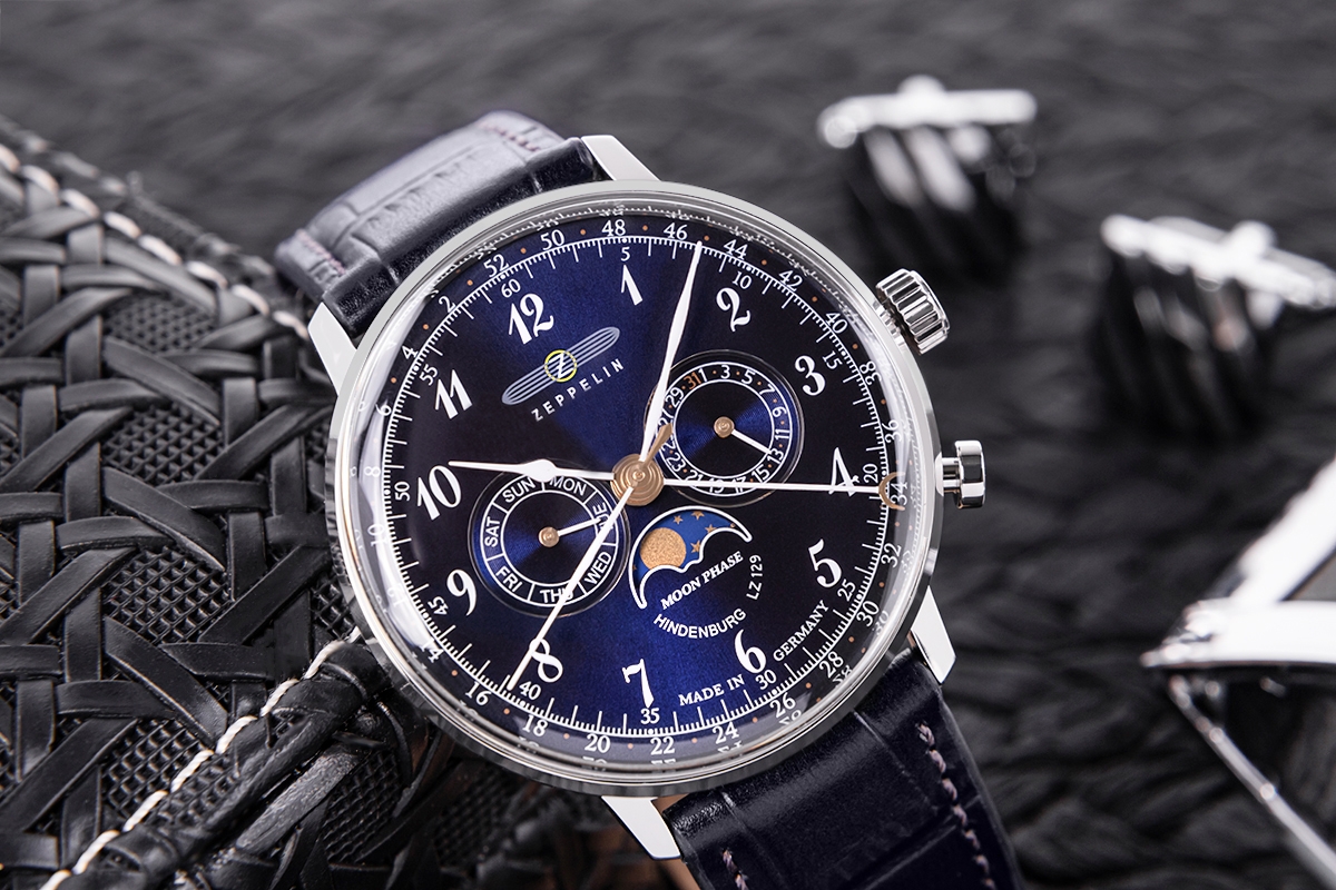 Zeppelin 7036-3 należy do linii LZ129 Hindenburg, jednej z bardziej eleganckich rodzin tej marki. Smuklejsza tarcza, klasyczne proporcje i wskaźnik faz księżyca sprawiają, że ten model wyraźnie idzie w stronę spokojniejszej, bardziej ubieranej klasyki.