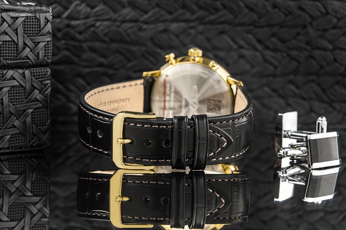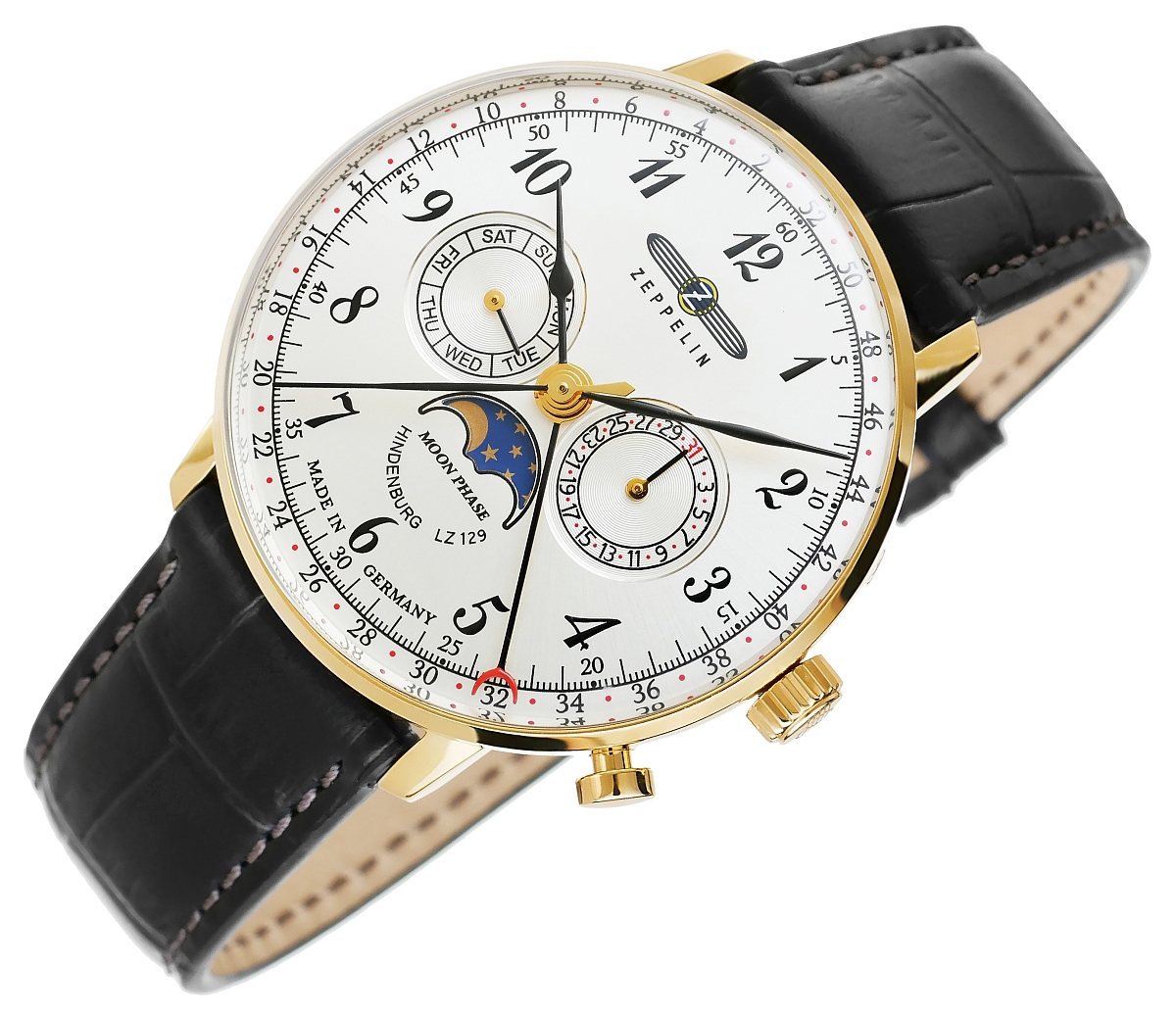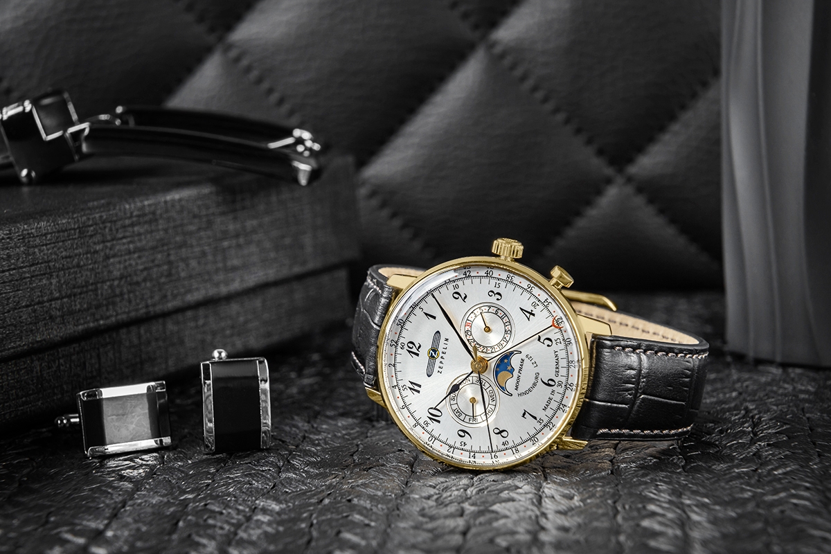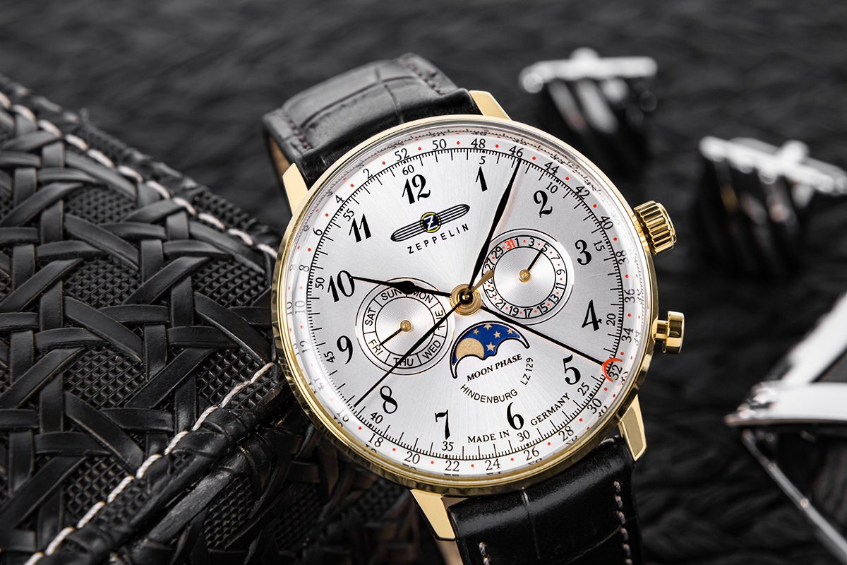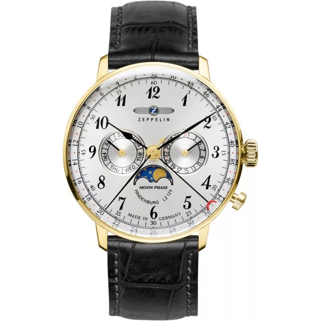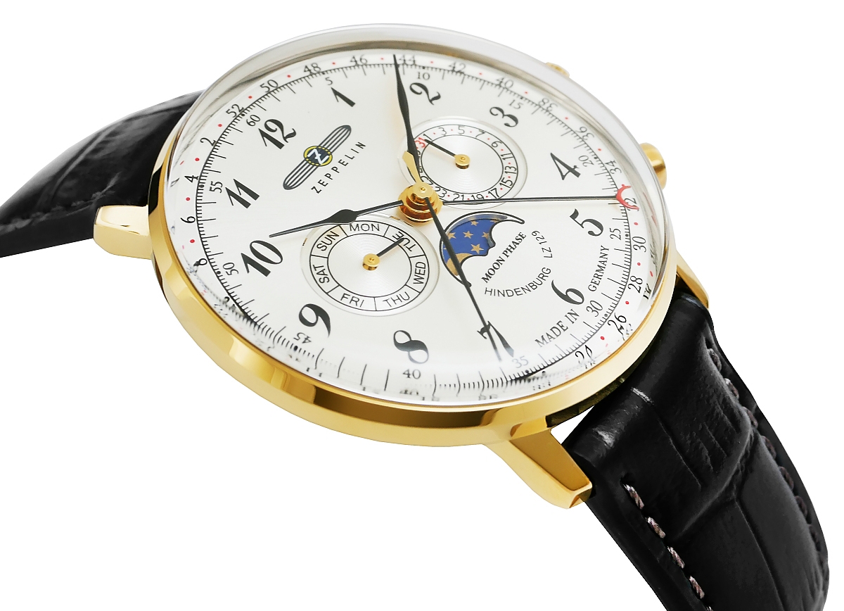 Zeppelin 7038-1 należy do linii LZ129 Hindenburg, jednej z bardziej eleganckich rodzin tej marki. Smuklejsza tarcza, klasyczne proporcje i wskaźnik faz księżyca sprawiają, że ten model wyraźnie idzie w stronę spokojniejszej, bardziej ubieranej klasyki.