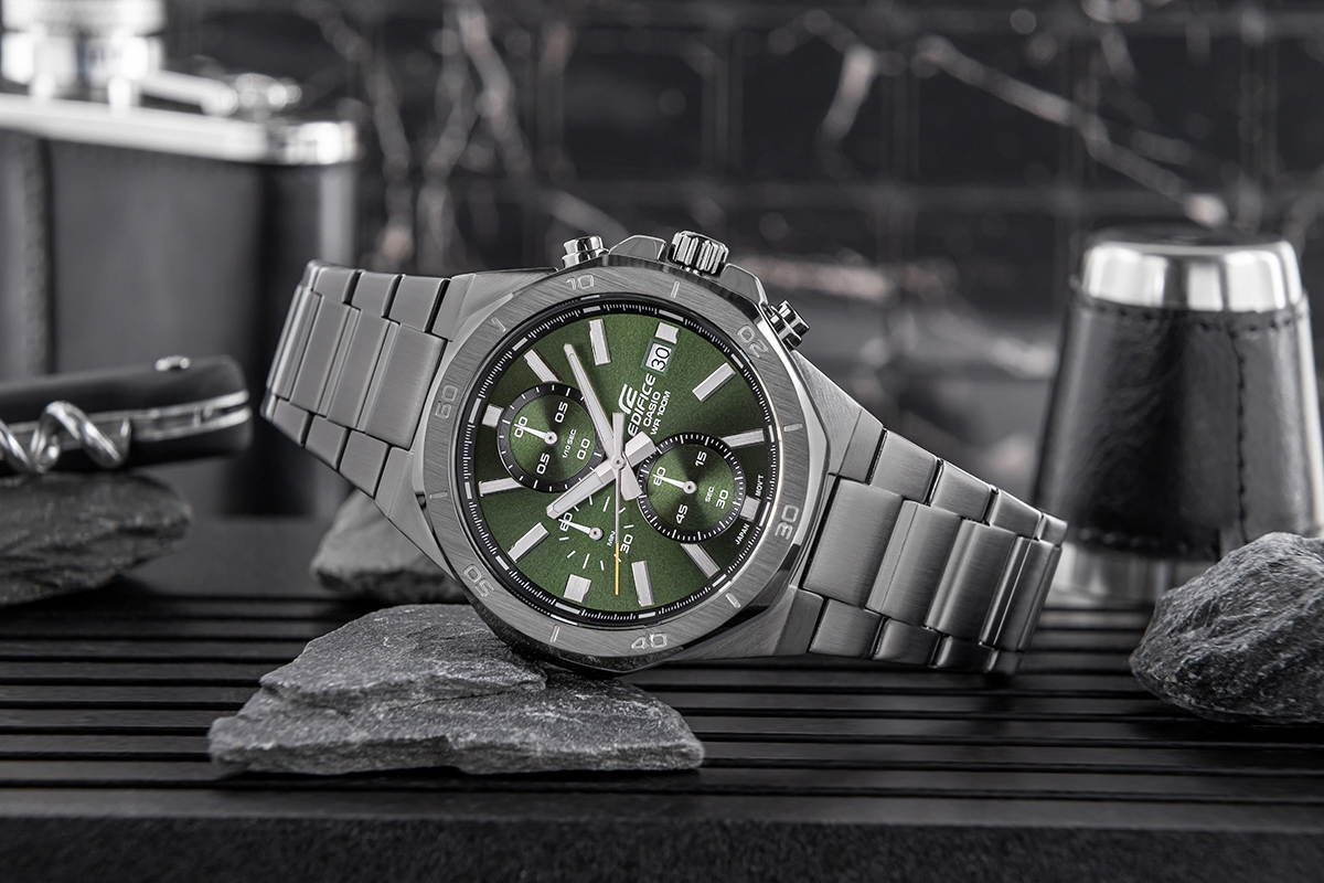 Szara koperta i bransoleta w połączeniu z zieloną tarczą nadają zegarkowi nowoczesny wygląd, podkreślony srebrnymi i pomarańczowymi akcentami. Funkcje takie jak chronograf (stoper), datownik oraz fluorescencyjne wskazówki zapewniają nie tylko styl, ale i praktyczność na co dzień.